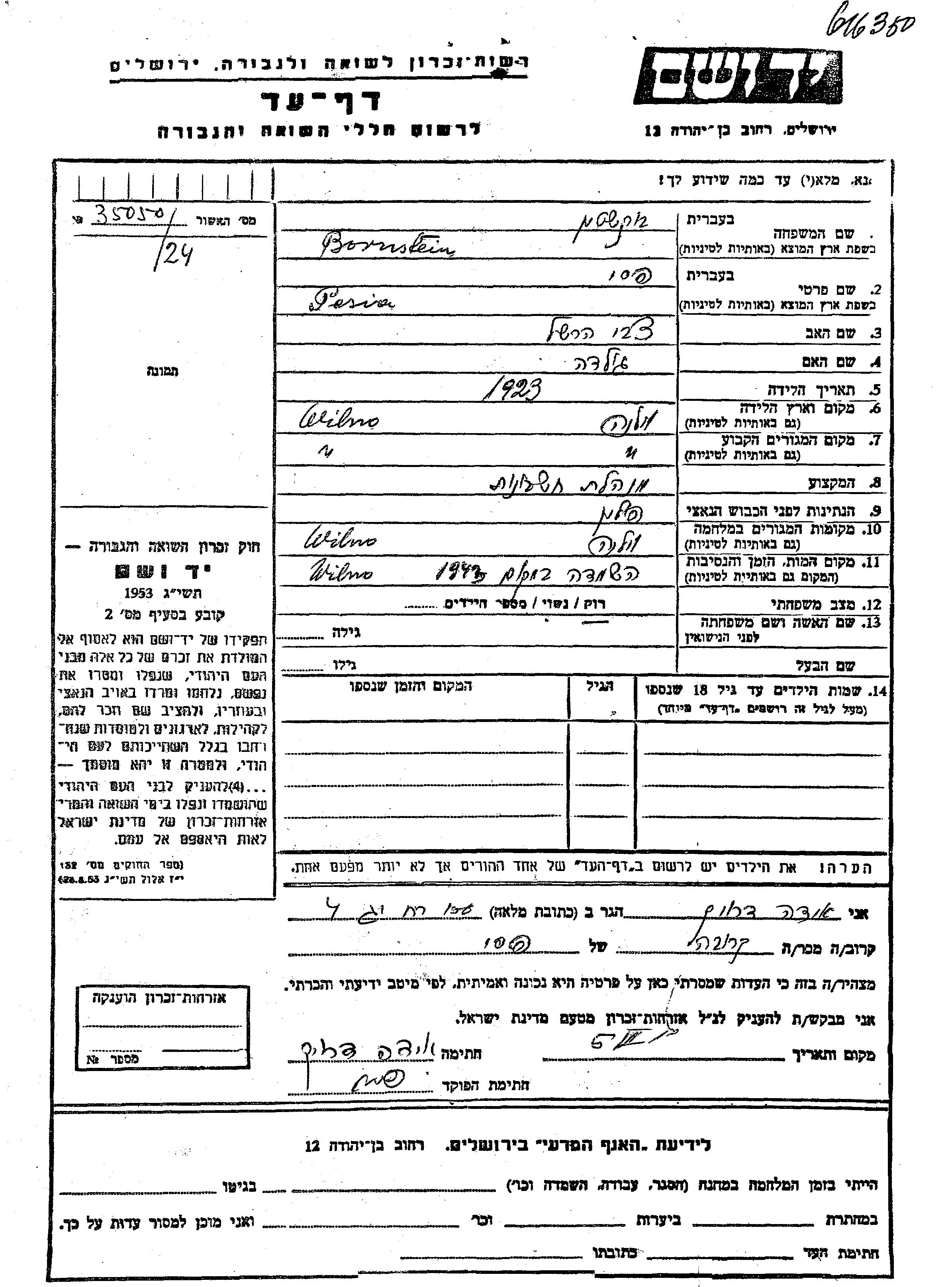 Pesi Bornstein wurde im Jahr 1923 in Wilno, Polen geboren. Sie war die Tochter von Tzvi Hershel und Golda. Sie war Buchhalter/-in und Ledig. Vor dem Zweiten Weltkrieg lebte sie in Wilno, Polen. Während des Krieges war sie in Wilno, Polen.