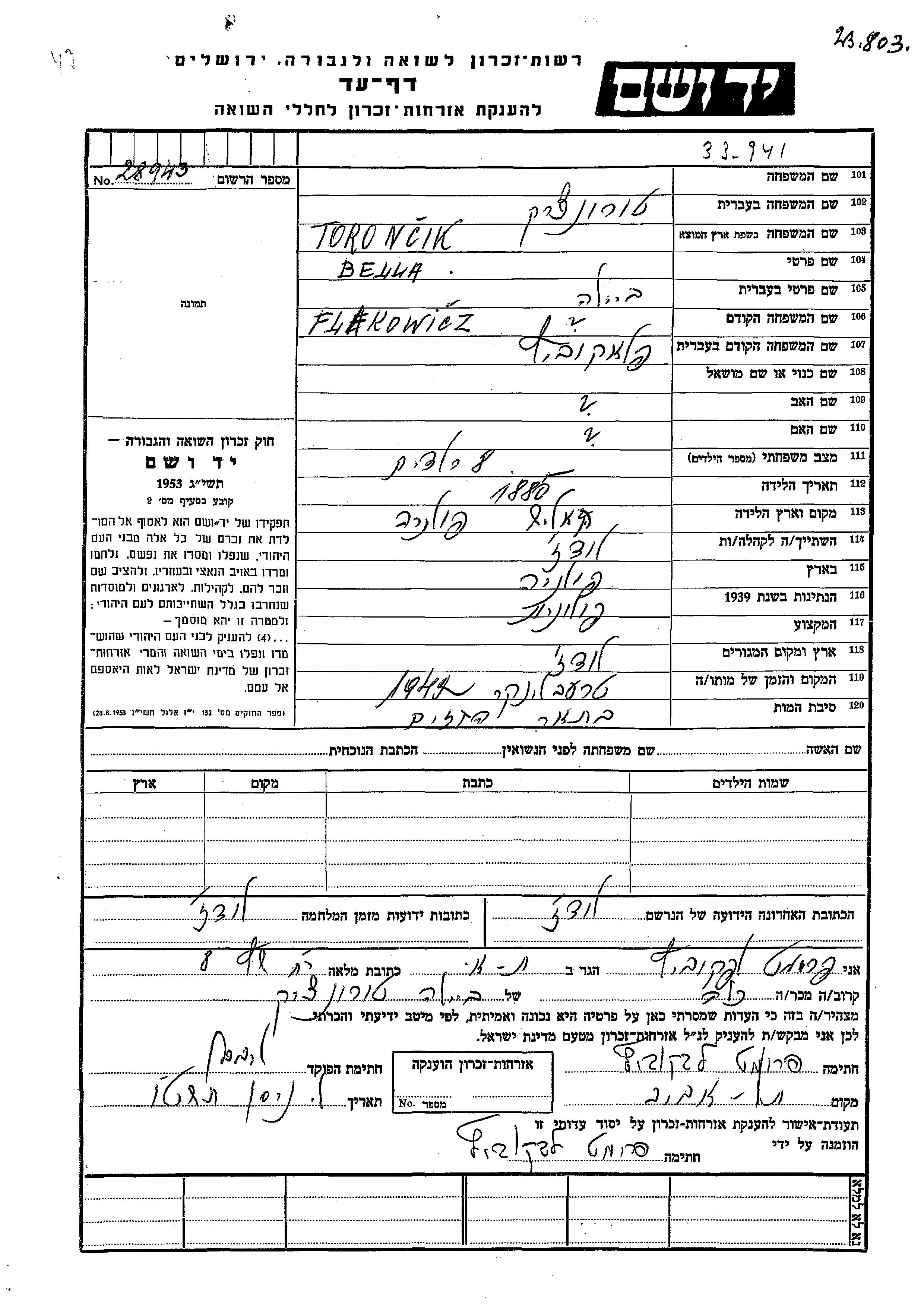 Bella Toroncik wurde im Jahr 1885 in Kalisz, Polen geboren. Sie war Verheiratet. Vor dem Zweiten Weltkrieg lebte sie in Lodz, Polen. Während des Krieges war sie in Lodz, Polen.