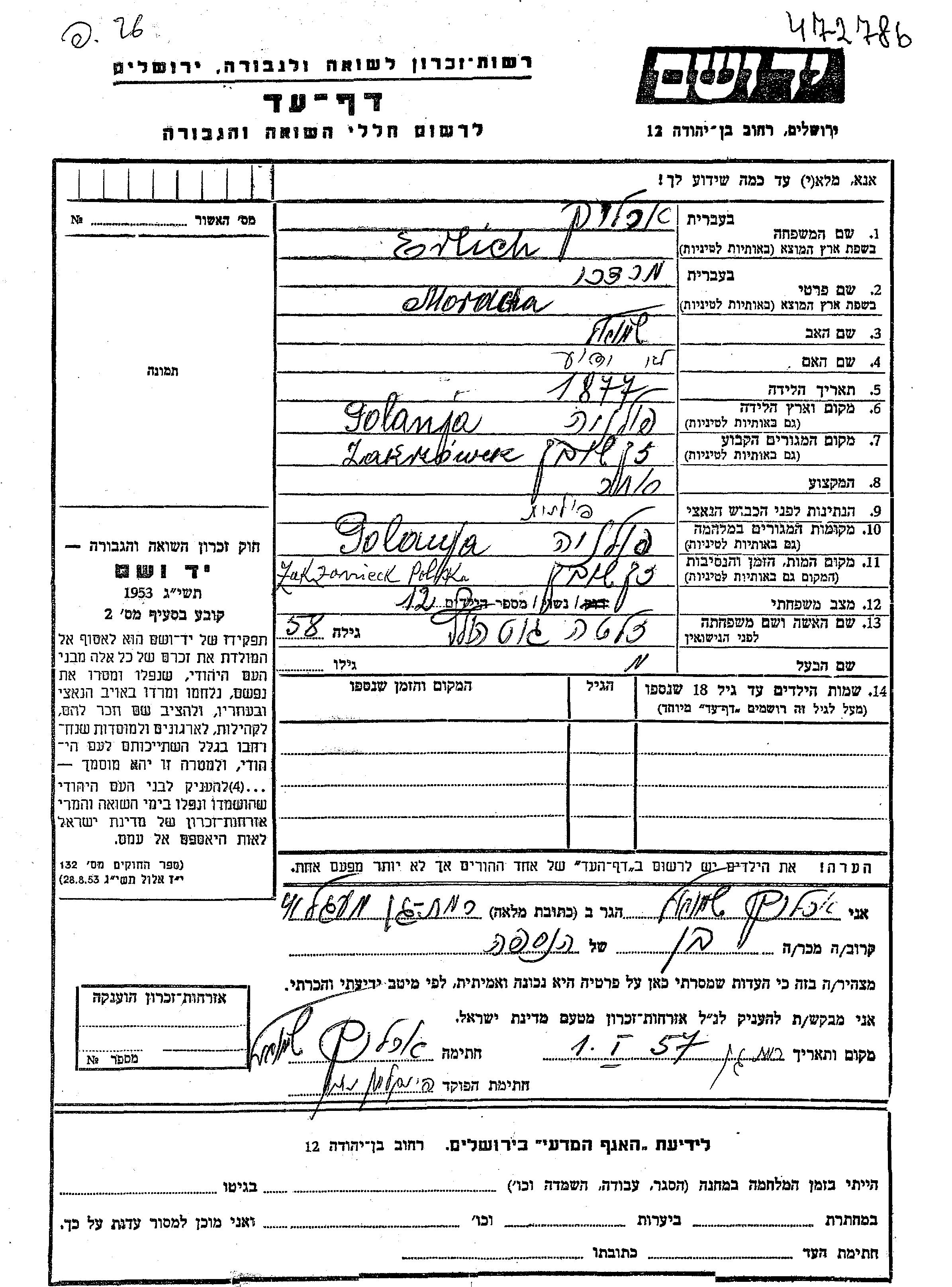 Mordcha Erlich wurde im Jahr 1877 in Polen geboren. Er war der Sohn von Shmuel. Er war Kaufmann/-frau und mit Zlata, geb. Gutholtz Verheiratet. Vor dem Zweiten Weltkrieg lebte er in Zakrzowek, Polen. Während des Krieges war er in Polen.