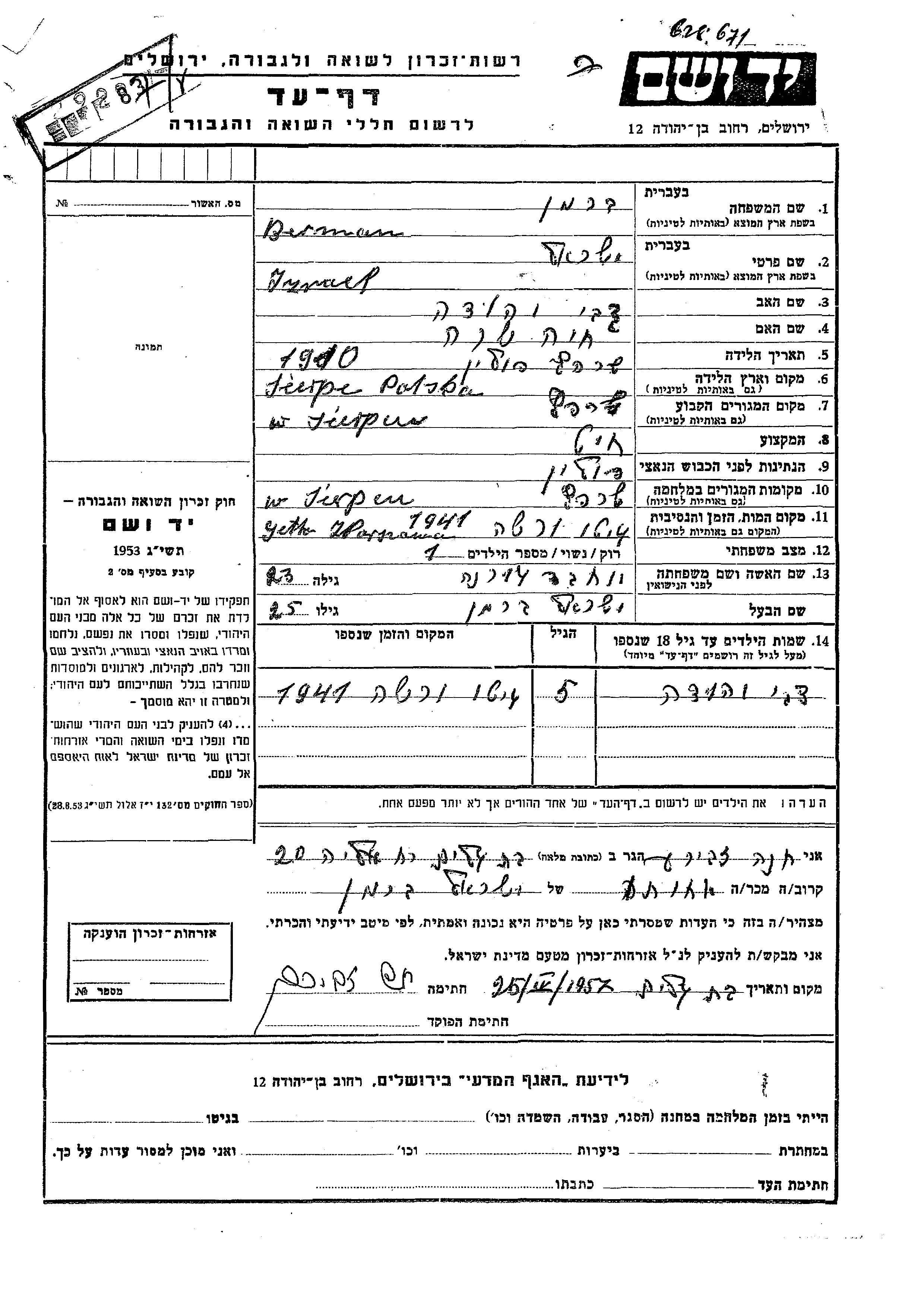 Izrael Berman wurde im Jahr 1910 in Sierpc, Polen geboren. Er war der Sohn von Tzvi Yehuda und Khaia Sara. Er war Schneider und mit Chana, geb. Gurna Verheiratet. Vor dem Zweiten Weltkrieg lebte er in Sierpc, Polen. Während des Krieges war er in Sierpc, Polen.