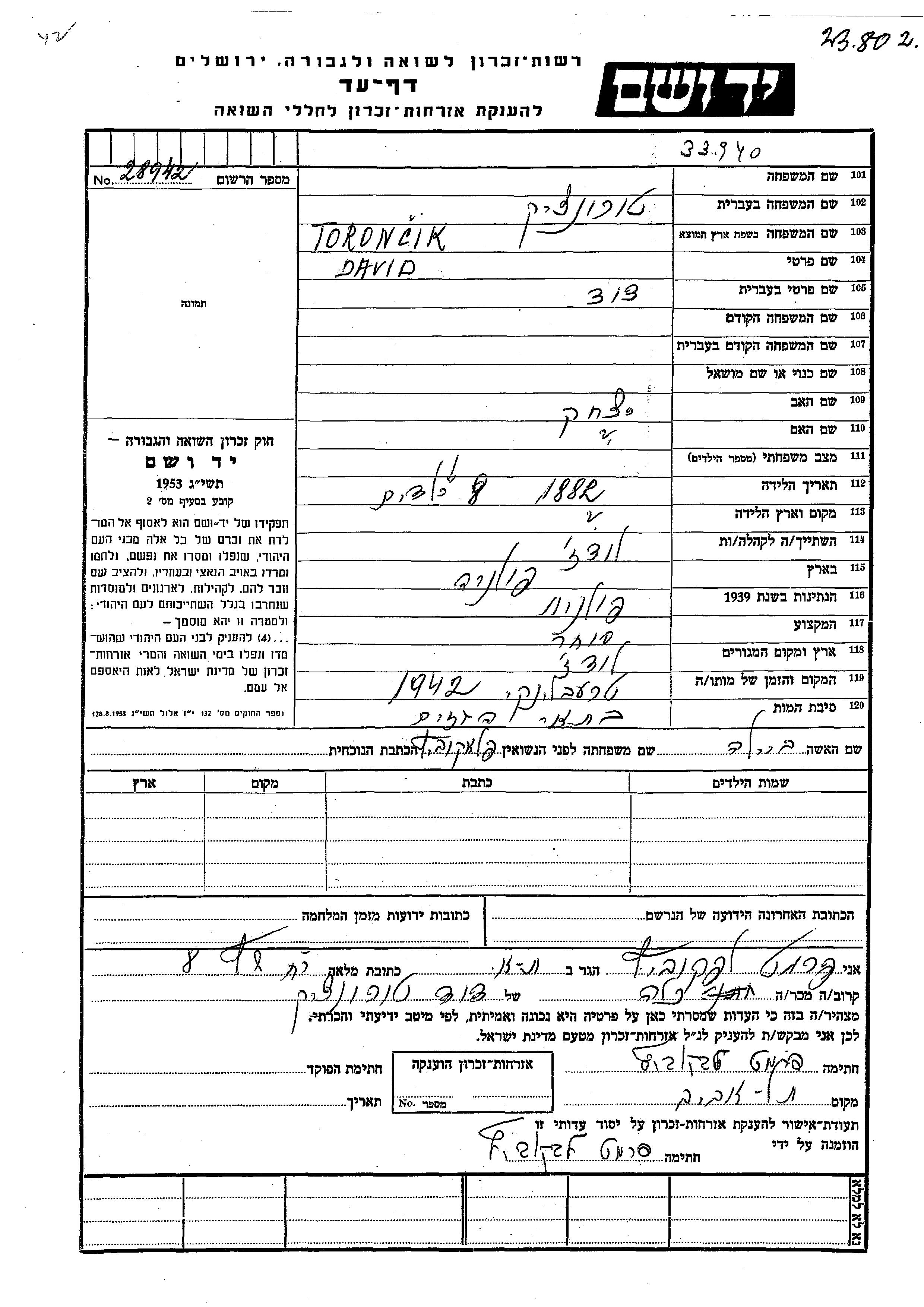 David Toroncik wurde im Jahr 1882 geboren. Er war der Sohn von Yitzkhak. Er war Kaufmann/-frau und mit Beila, geb. Falkovitz Verheiratet. Vor dem Zweiten Weltkrieg lebte er in Lodz, Polen.