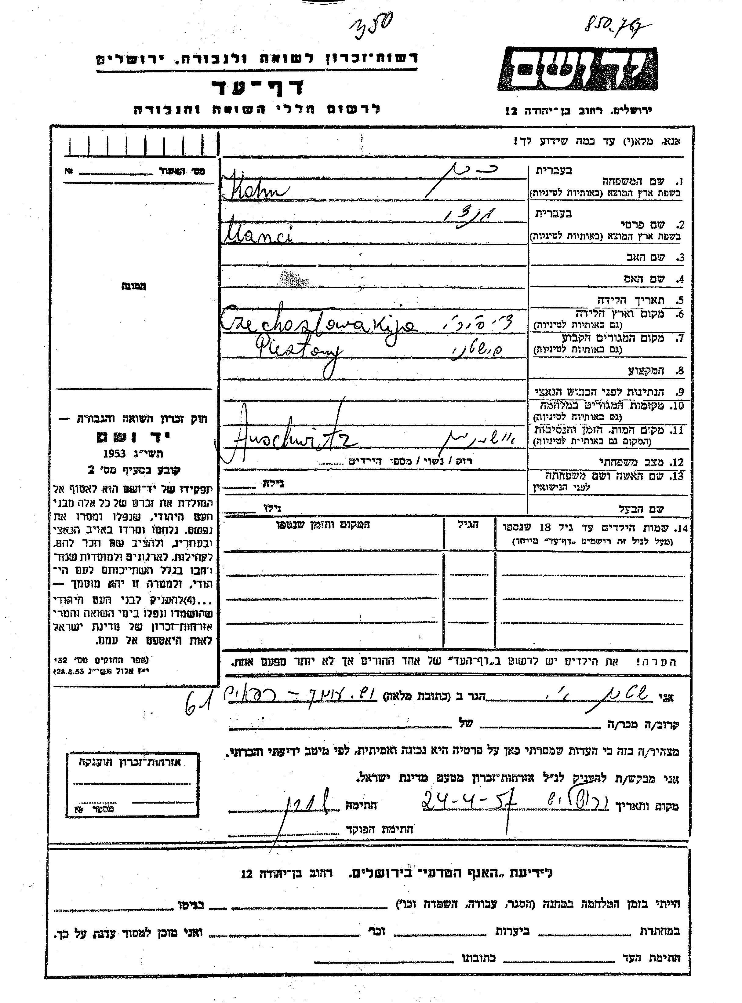 Manci Kohn wurde in Tschechoslowakei geboren. Vor dem Zweiten Weltkrieg er/sie in Pistany, Tschechoslowakei.