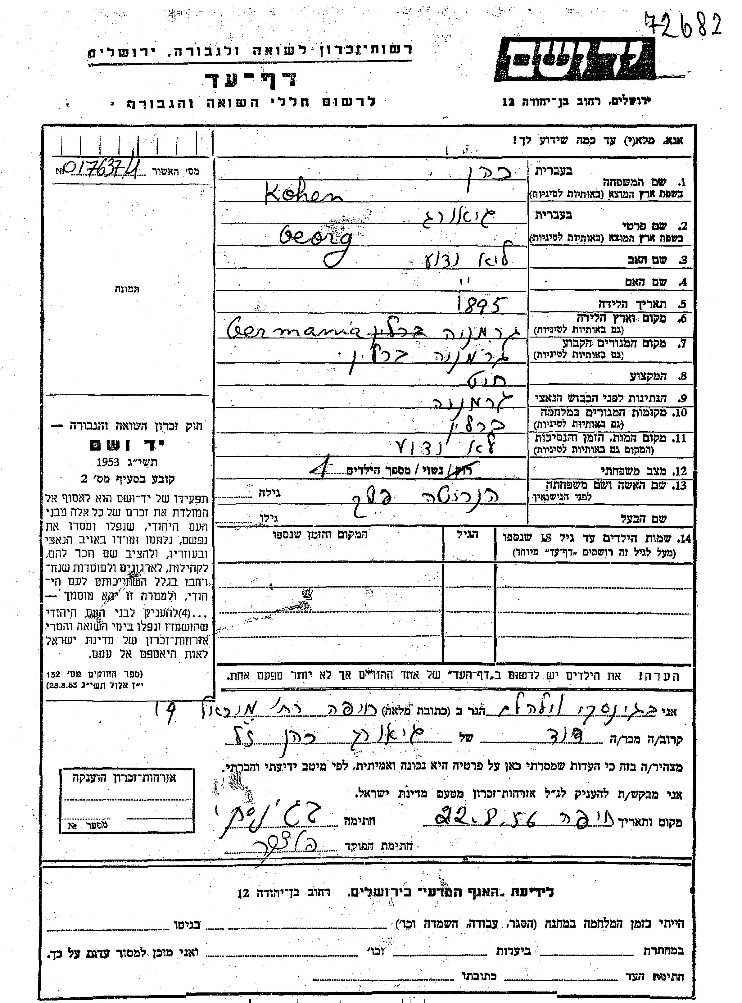 Georg Kohen wurde im Jahr 1895 in Deutsches Reich geboren. Er war Schneider und mit Henrieta, geb. Valk Verheiratet. Vor dem Zweiten Weltkrieg lebte er in Berlin, Deutsches Reich. Während des Krieges war er in Berlin, Deutsches Reich.