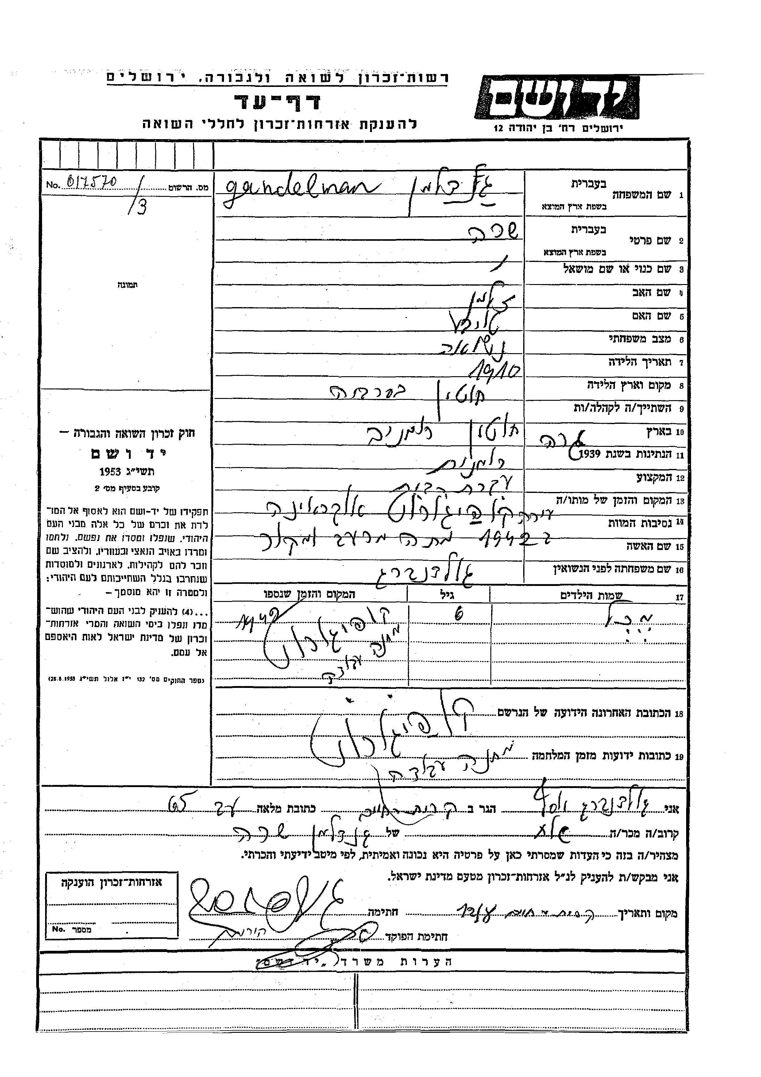 Sara Gandelman, geb. Goldenberg wurde im Jahr 1910 in Hotin, Rumänien geboren. Sie war die Tochter von Zalman und Toibe. Sie war Hausfrau und Verheiratet. Vor dem Zweiten Weltkrieg lebte sie in Hotin, Rumänien. Während des Krieges war sie in Kopaigorod, Ukraine (UdSSR).