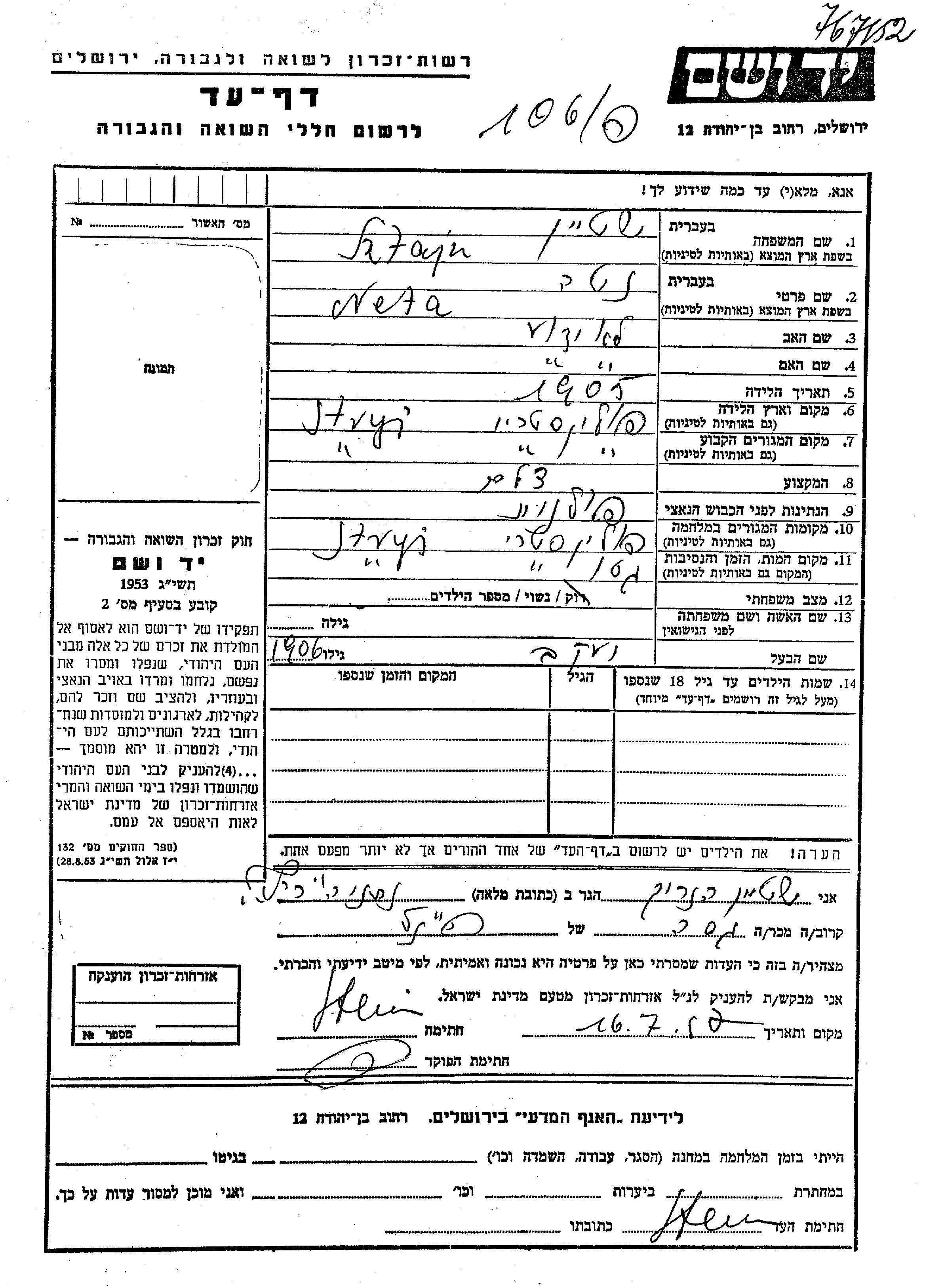 Neta Sztajn wurde im Jahr 1905 in Stryj, Polen geboren. Er war Fotograf/-in und mit Yaakov Verheiratet. Vor dem Zweiten Weltkrieg lebte er in Stryj, Polen. Während des Krieges war er in Stryj, Polen.