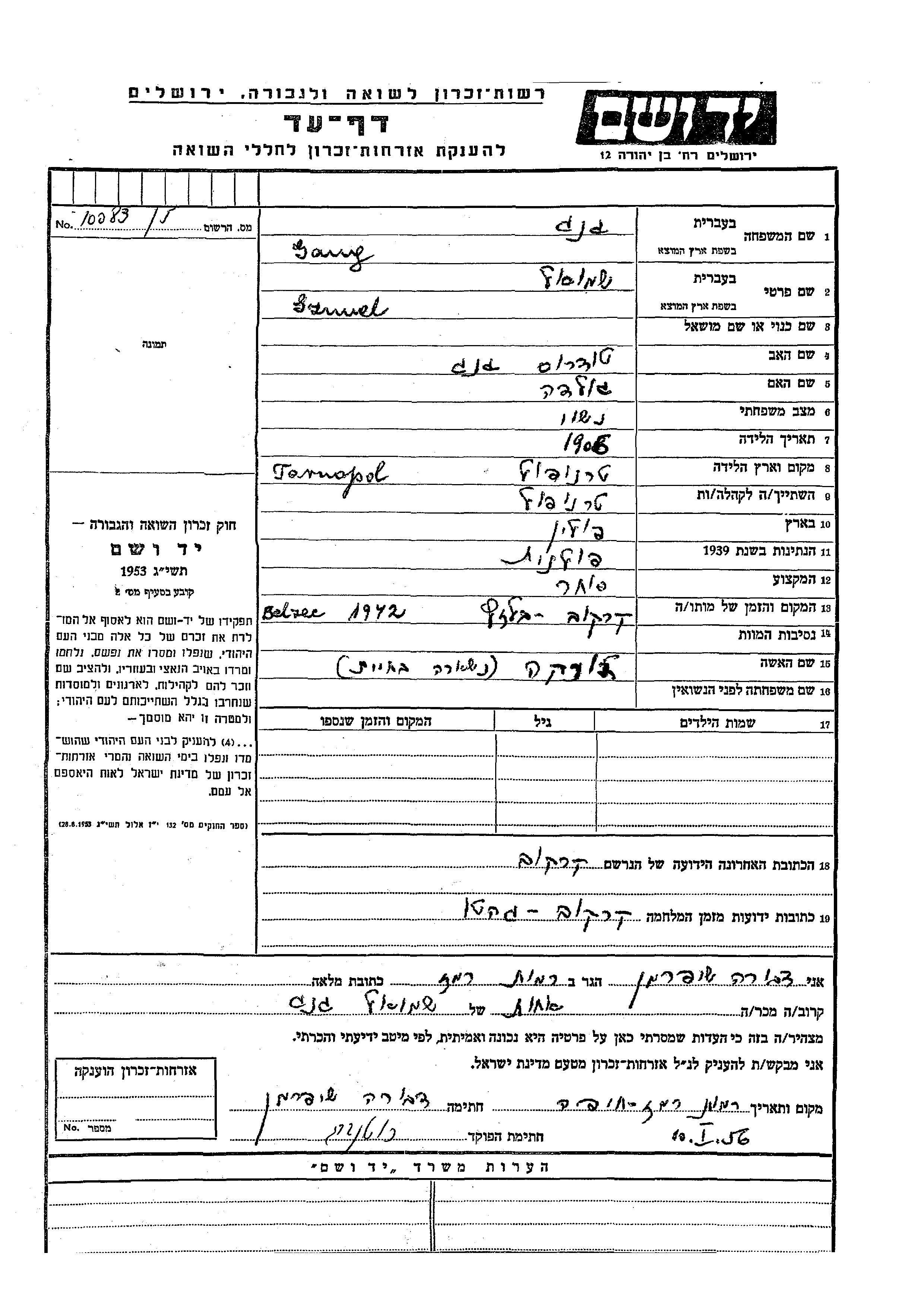 Szmuel Gang wurde im Jahr 1905 in Tarnopol, Polen geboren. Er war der Sohn von Todros und Golda. Er war Kaufmann/-frau und mit Dona Verheiratet. Vor dem Zweiten Weltkrieg lebte er in Krakow, Polen. Während des Krieges war er in Krakow, Polen.