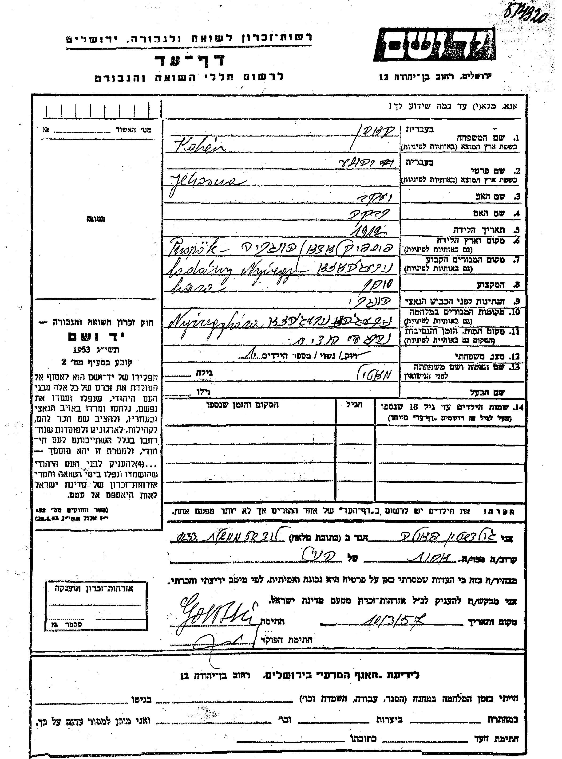 Jehosua Kohen wurde im Jahr 1912 in Puspoki, Ungarn geboren. Er war der Sohn von Yaakov und Rivka. Er war Kaufmann/-frau und mit Matil Verheiratet. Vor dem Zweiten Weltkrieg lebte er in Nyiregyhaza, Ungarn. Während des Krieges war er in Nyiregyhaza, Ungarn.