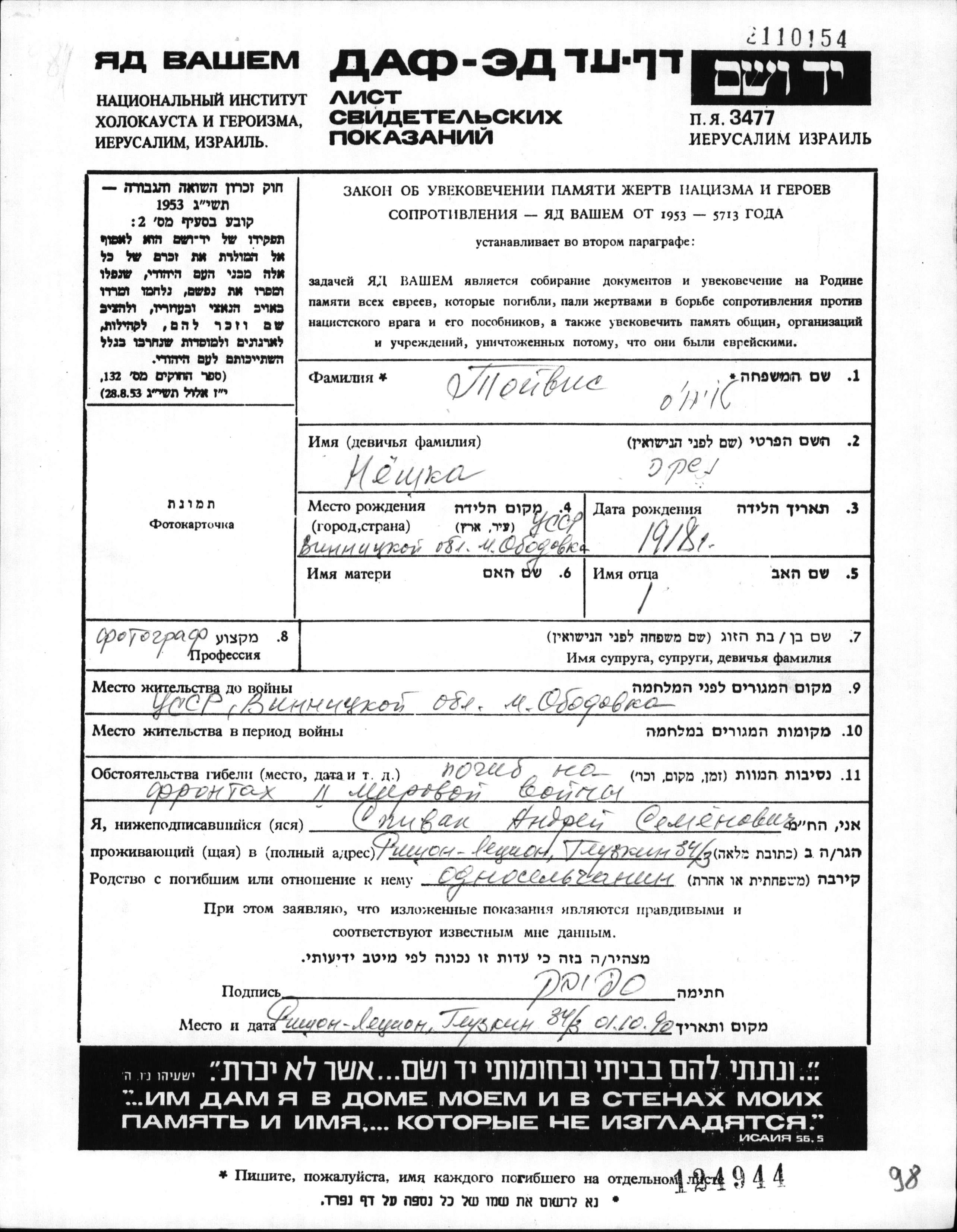 Nyoshka Toivis wurde im Jahr 1918 in Obodovka, Ukraine (UdSSR) geboren. Er war Fotograf/-in. Vor dem Zweiten Weltkrieg lebte er in Obodovka, Ukraine (UdSSR). Während des Krieges war er in die Sowjetischen Streitkräfte. Nyoshka im Militärdienst umgekommen.