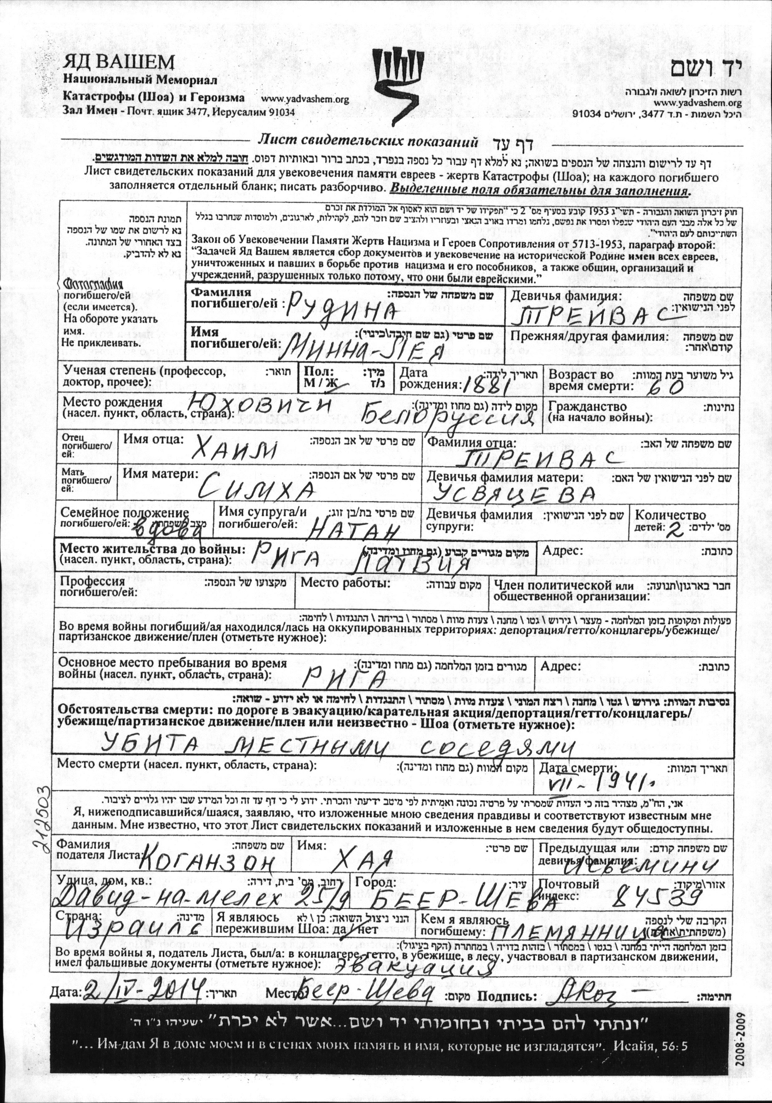 Minna Leya Rudina, geb. Trejvas wurde im Jahr 1881 in Yukhovichi, Weißrussland (UdSSR) geboren. Sie war die Tochter von Khayim und Simkha, geb. Usvyatzeva. Sie war mit Natan Witwe. Vor dem Zweiten Weltkrieg lebte sie in Riga, Lettland. Während des Krieges war sie in Riga, Lettland.