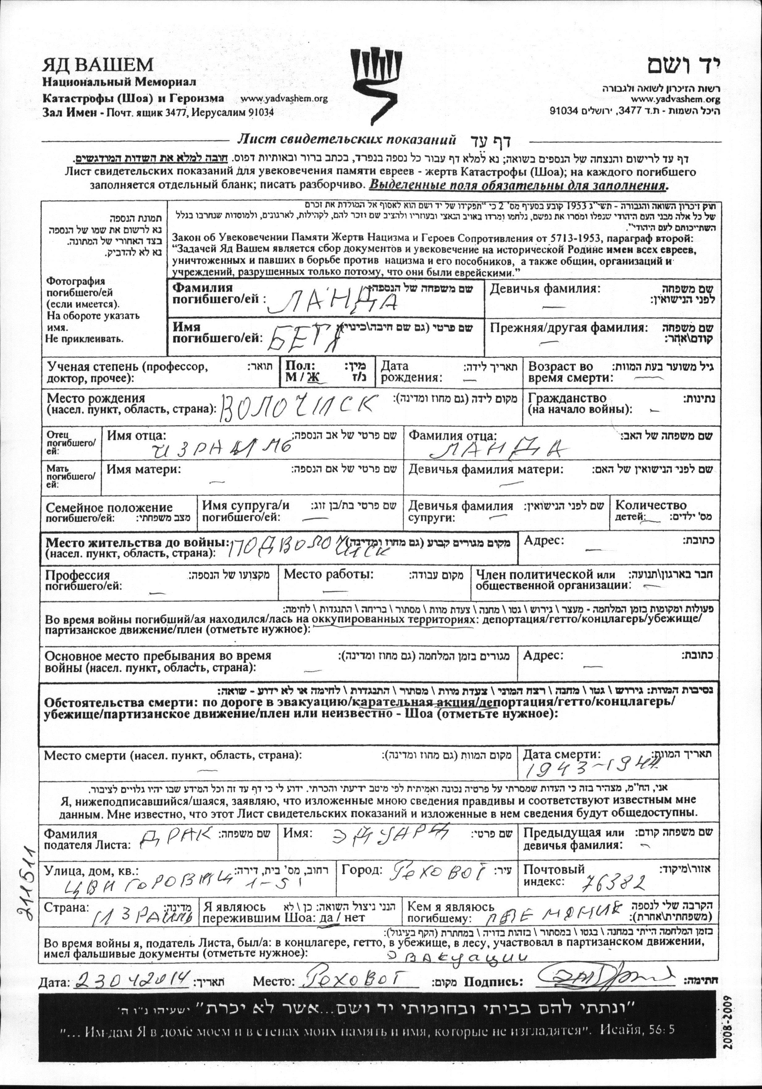 Landa Betya Podvolochisk, Polen Gedenkblatt