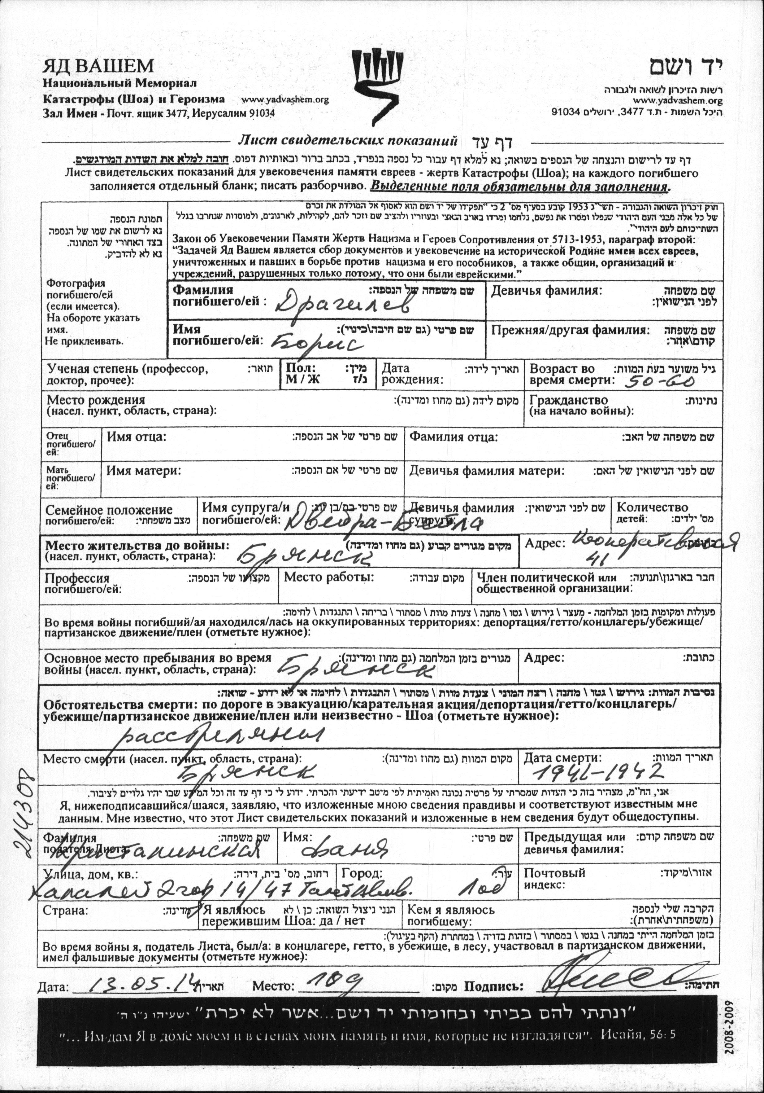 Boris Dragilev. Er war mit Dveyra Beyla Verheiratet. Vor dem Zweiten Weltkrieg lebte er in Bryansk, Russland (UdSSR). Während des Krieges war er in Bryansk, Russland (UdSSR).