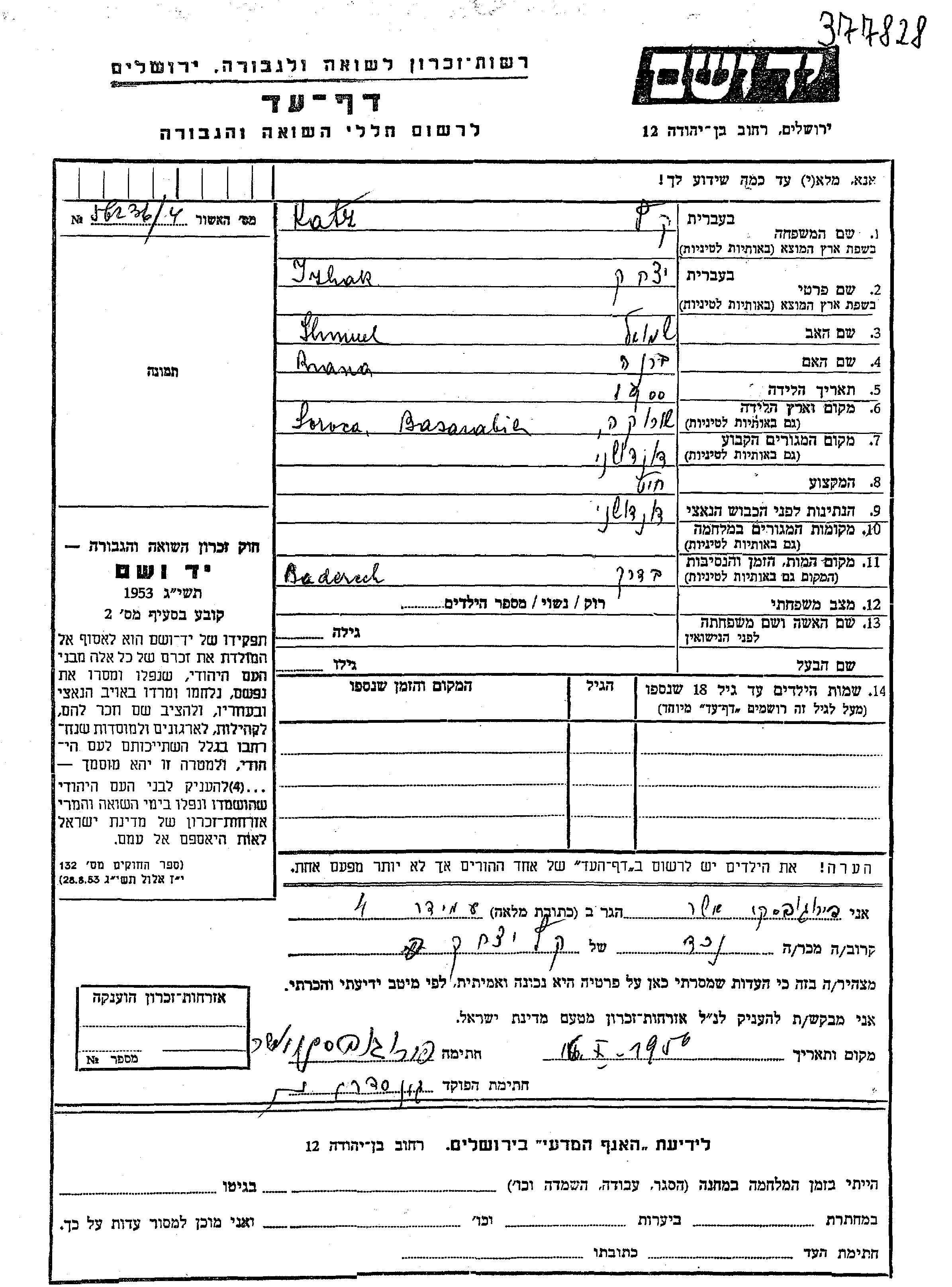 Jzhak Katz wurde im Jahr 1900 in Soroca, Rumänien geboren. Er war der Sohn von Shmuel und Brana. Er war Schneider. Vor dem Zweiten Weltkrieg lebte er in Dondosani, Rumänien. Während des Krieges war er in Dondosani, Rumänien.