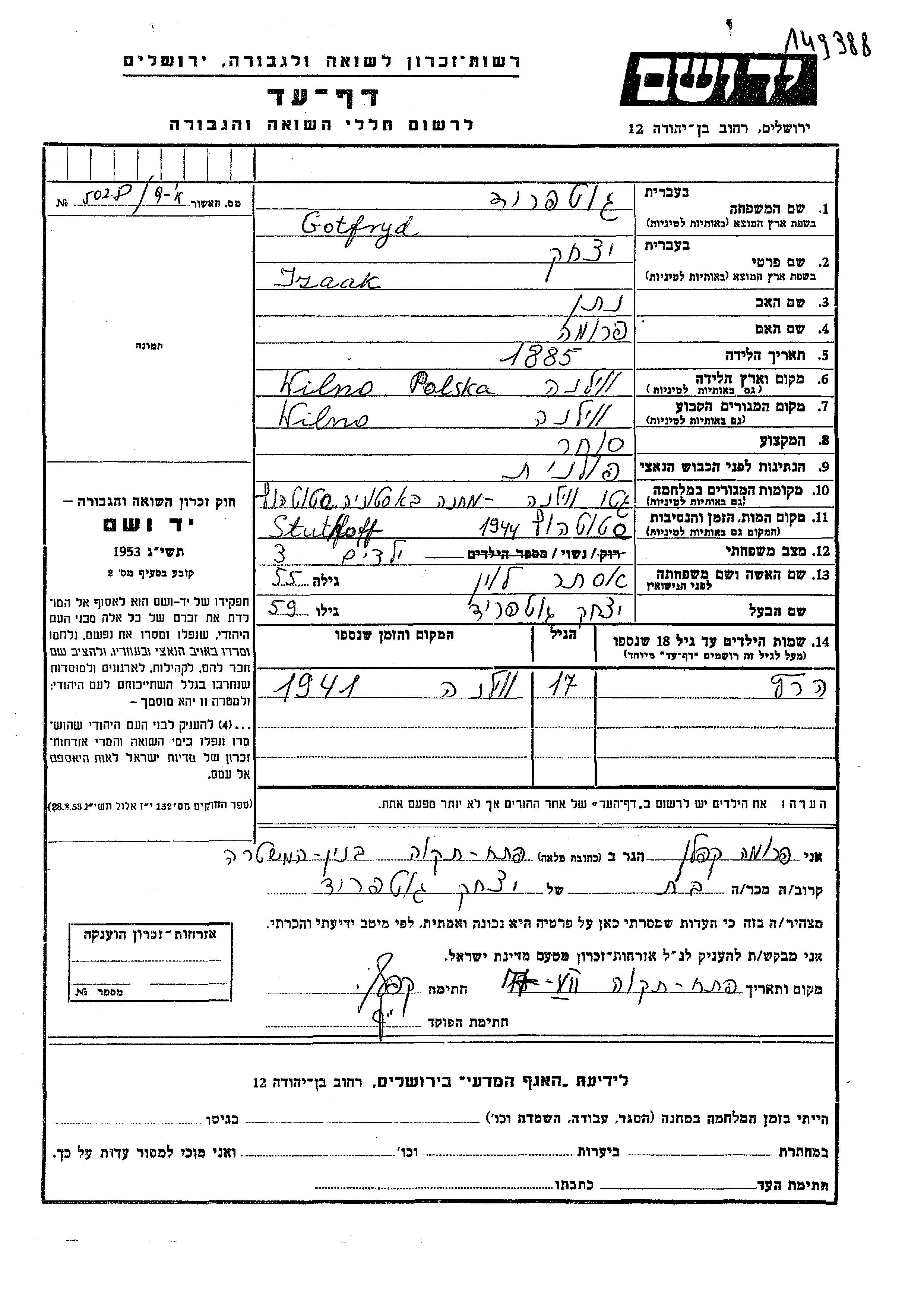 Izaak Gotfryd wurde im Jahr 1885 in Wilno, Polen geboren. Er war der Sohn von Natan und Fruma. Er war Kaufmann/-frau und mit Ester, geb. Levin Verheiratet. Vor dem Zweiten Weltkrieg lebte er in Wilno, Polen. Während des Krieges war er in Wilno, Polen.