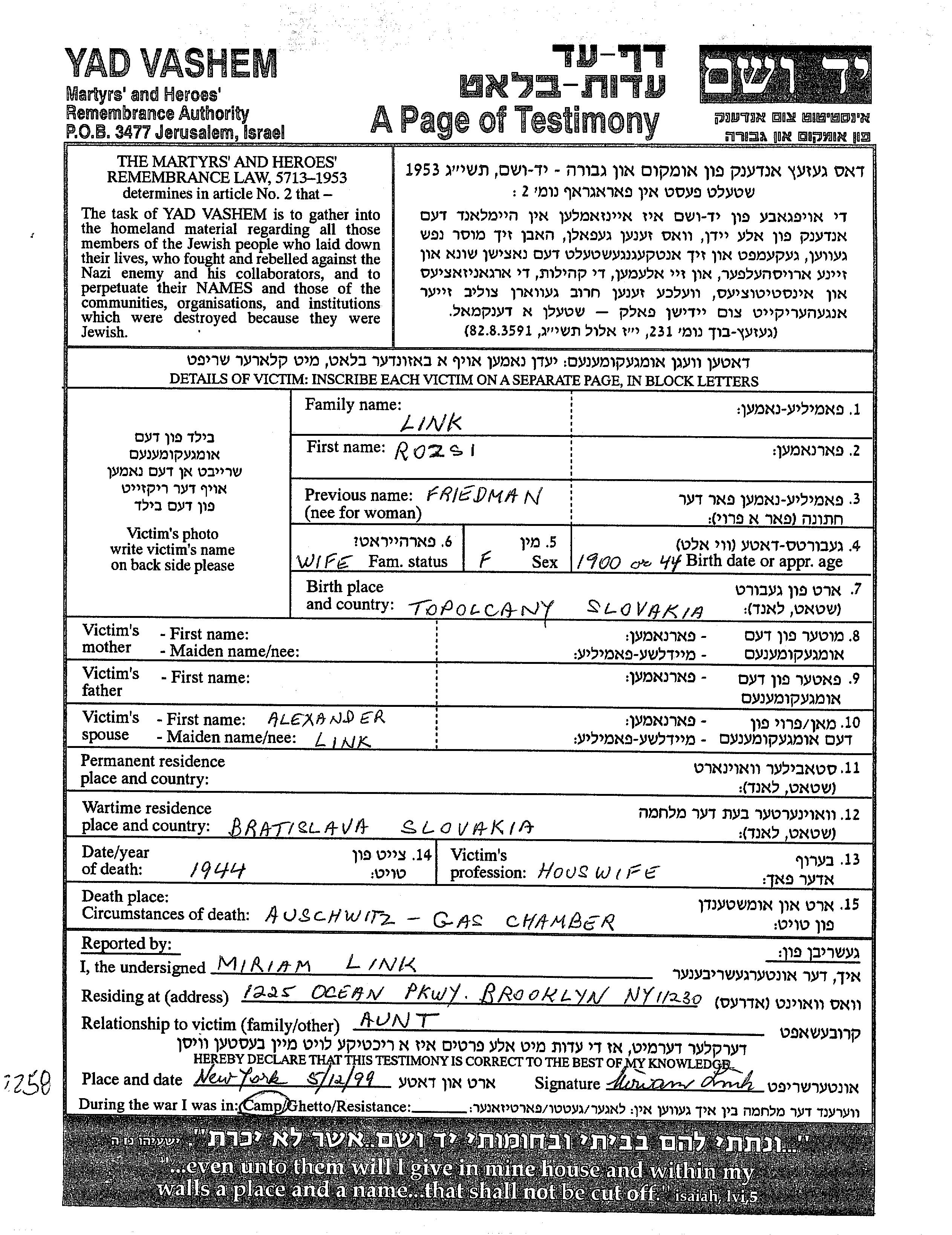 Rozsi Link, geb. Friedman wurde im Jahr 1900 in Topolcany, Tschechoslowakei geboren. Sie war mit Alexander Verheiratet. Während des Krieges war sie in Bratislava, Tschechoslowakei.