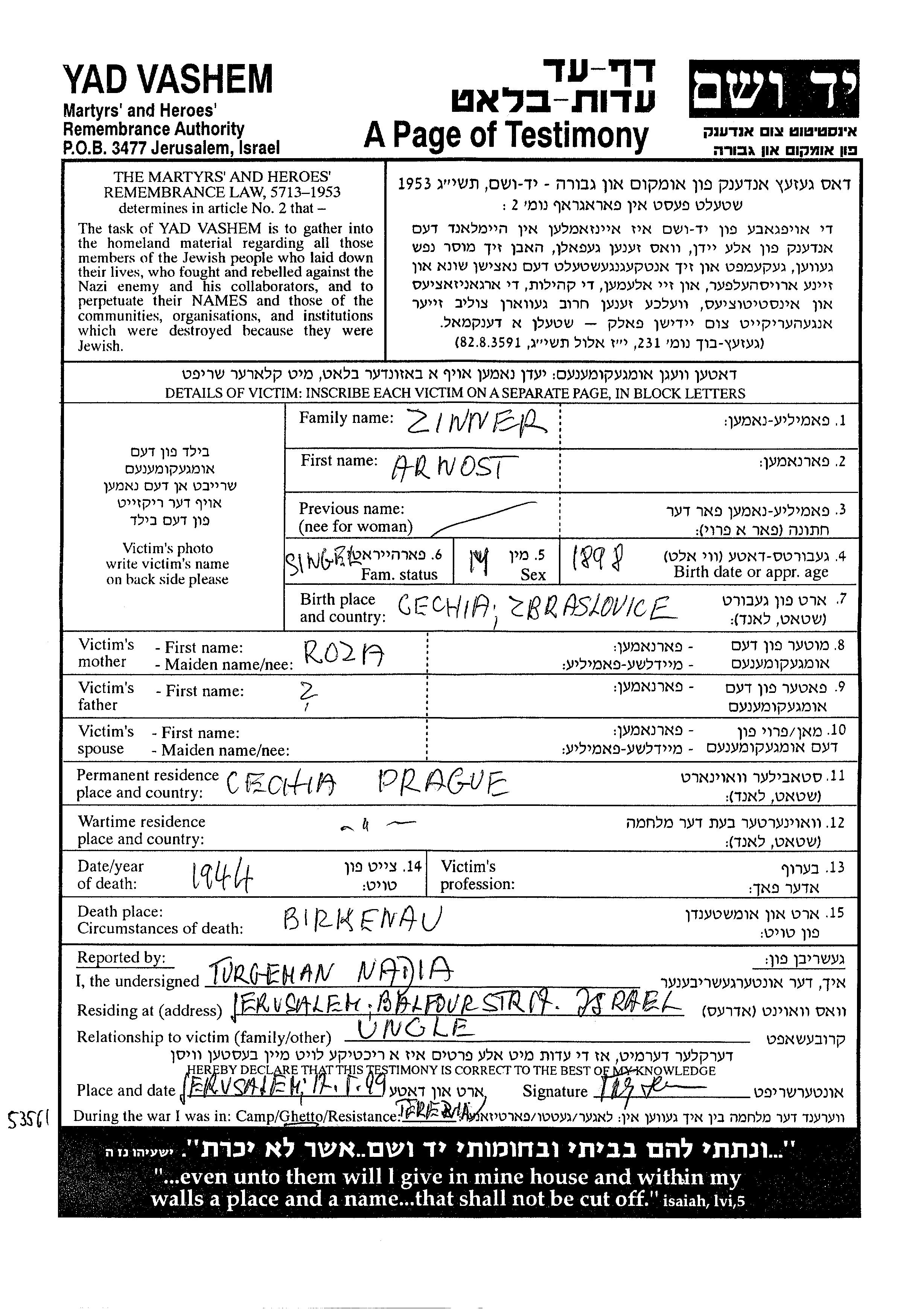 Arnost wurde in der Schoah ermordet. Todesort: Birkenau, Polen im Jahr 1944.