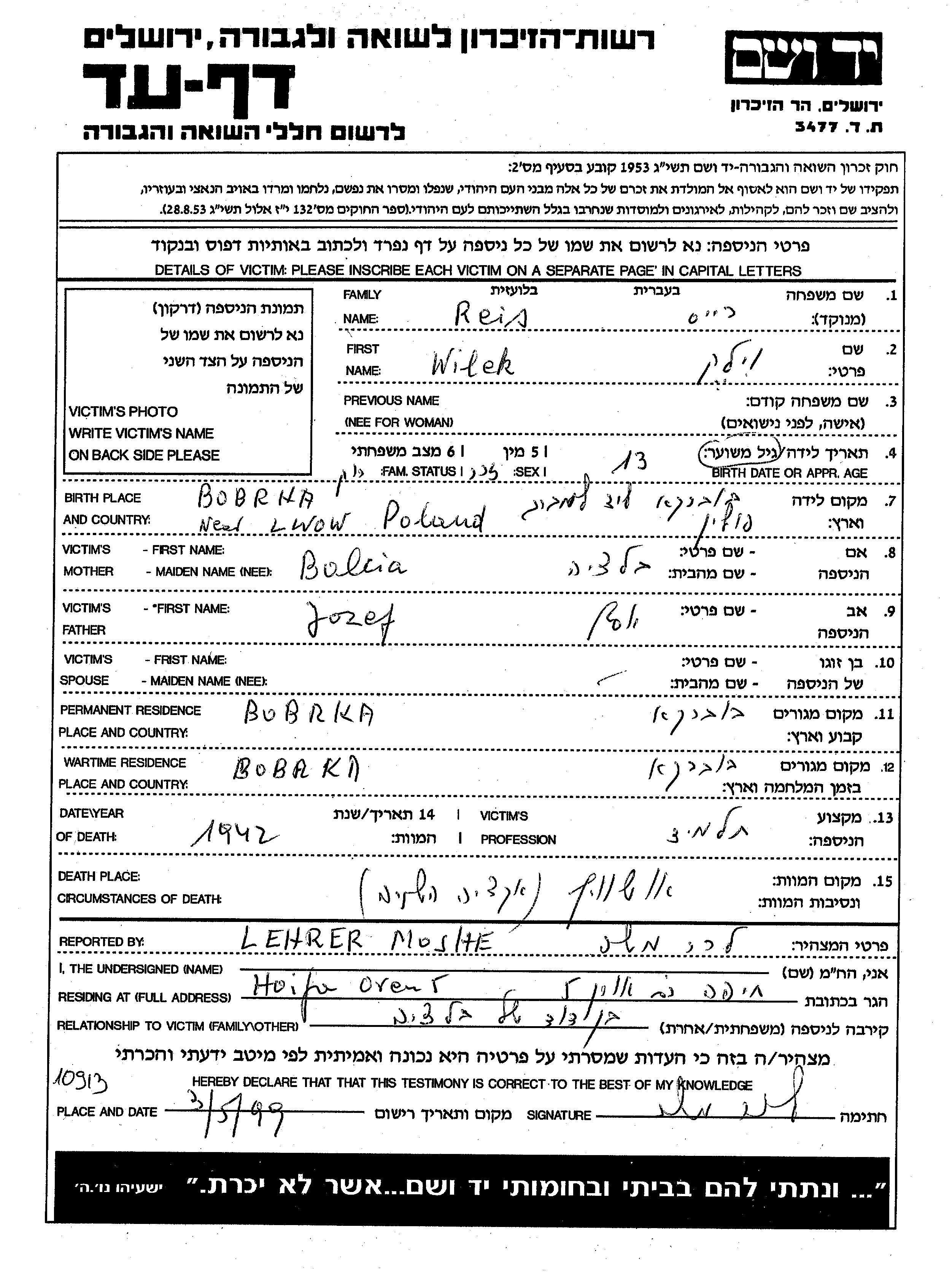 Volf Reis wurde in Bobrka, Polen geboren. Er war der Sohn von Josef und Balcia. Er war Schüler/-in. Vor dem Zweiten Weltkrieg lebte er in Bobrka, Polen. Während des Krieges war er in Bobrka, Polen.