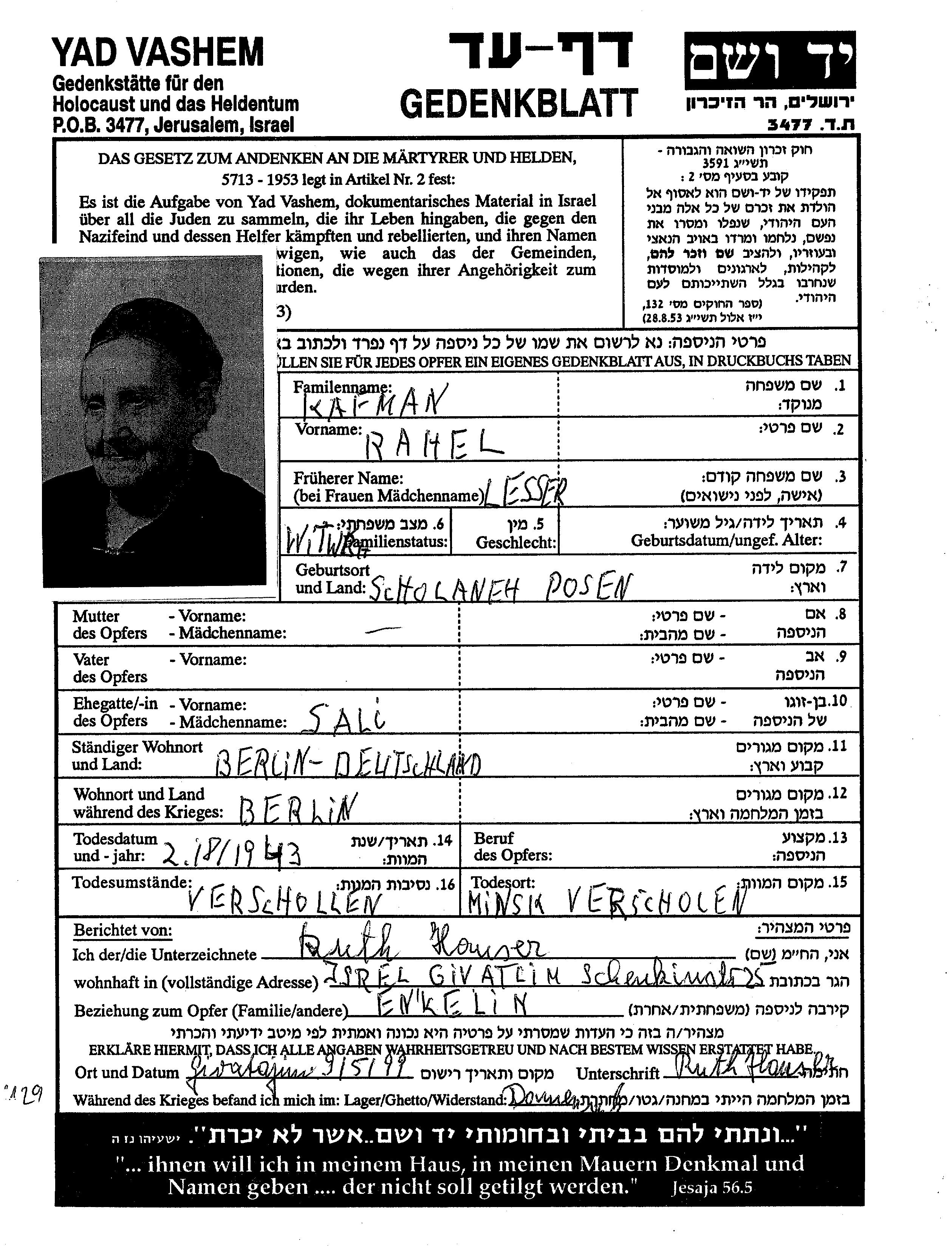Rahel wurde in der Schoah ermordet. Todesort: Minsk, Weißrussland (UdSSR) im Jahr 02/08/1943.