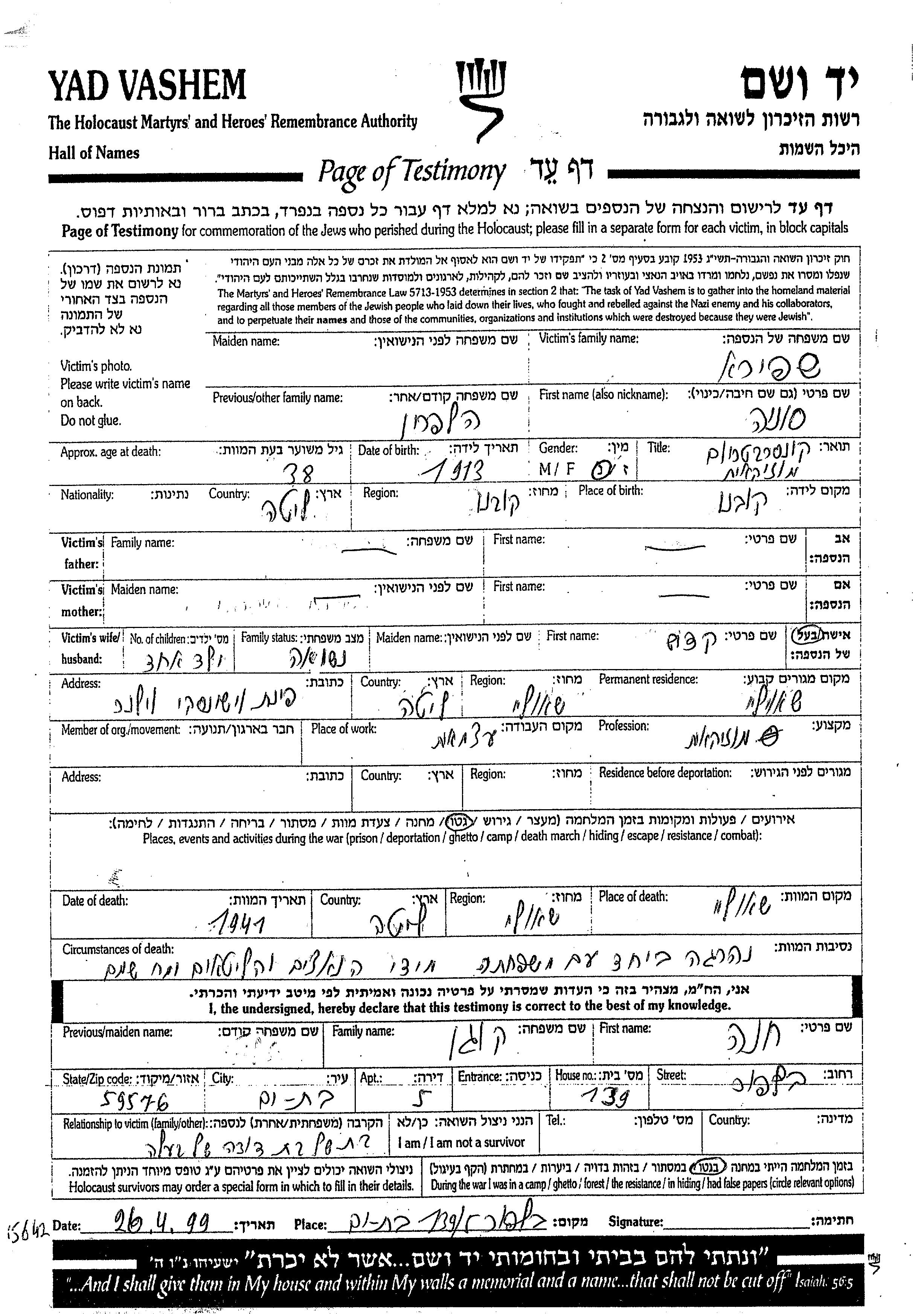 Shapira Halperin Sonia 1913 Sauliai, Litauen Gedenkblatt