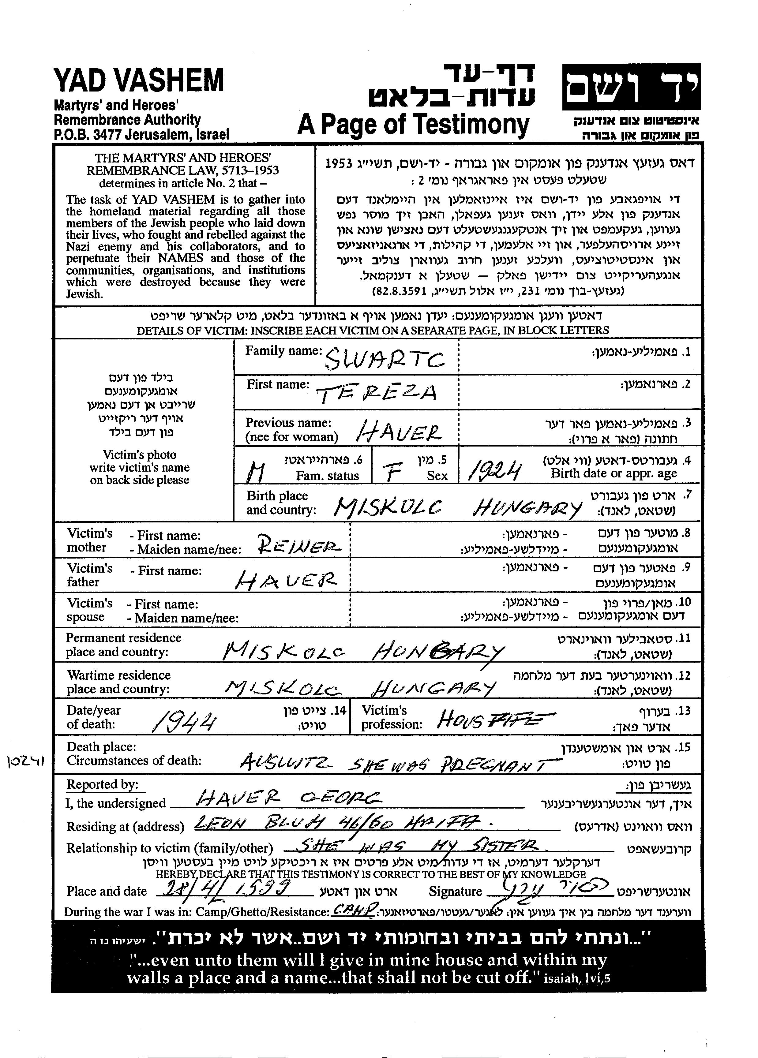 Tereza Swartc wurde im Jahr 1924 in Miskolc, Ungarn geboren. Sie war Hausfrau und Verheiratet. Vor dem Zweiten Weltkrieg lebte sie in Miskolc, Ungarn. Während des Krieges war sie in Miskolc, Ungarn.