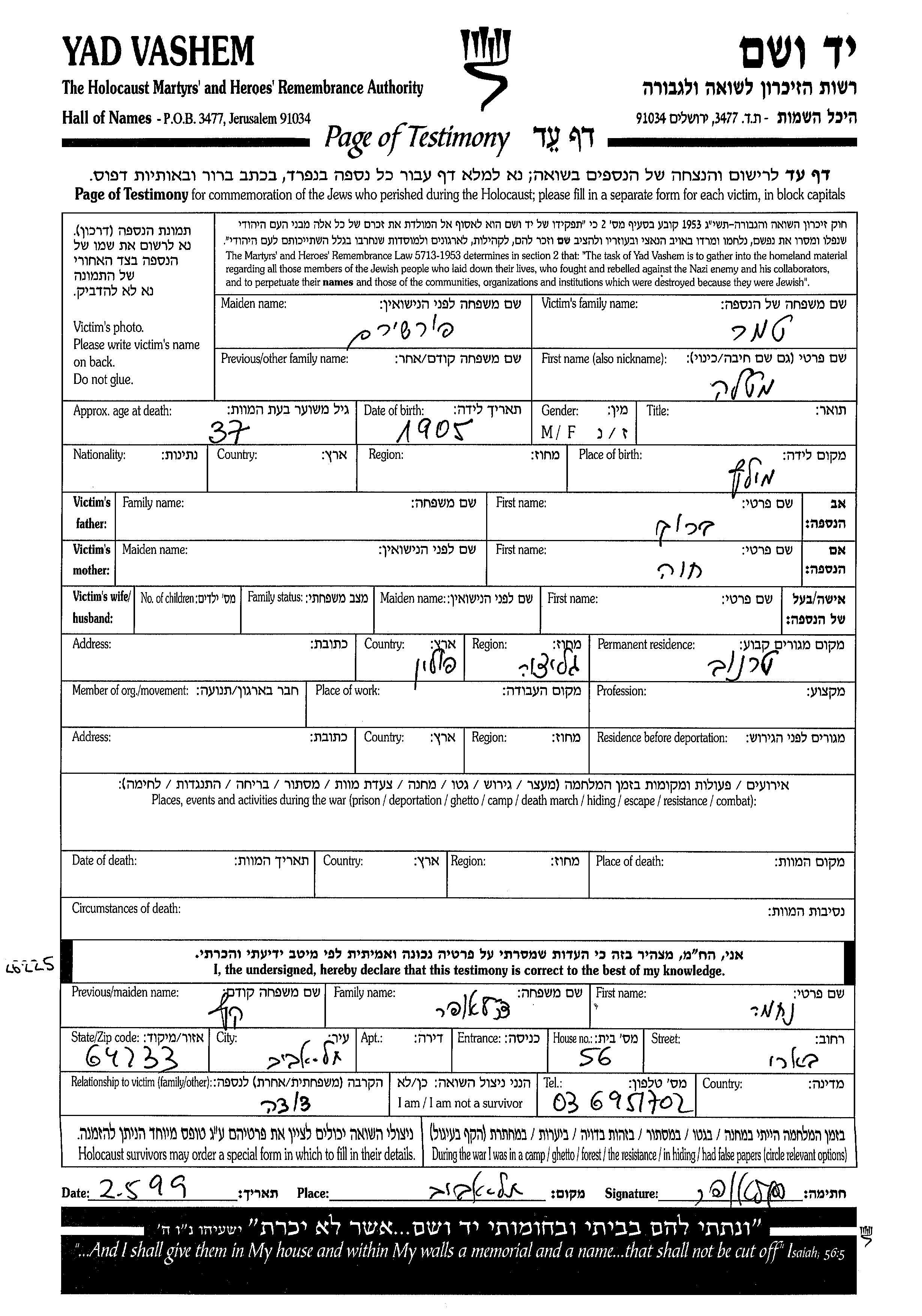 Matla Temer, geb. Forshirem wurde im Jahr 1905 in Mielec, Polen geboren. Sie war die Tochter von Barukh und Khava. Vor dem Zweiten Weltkrieg lebte sie in Tarnow, Polen.