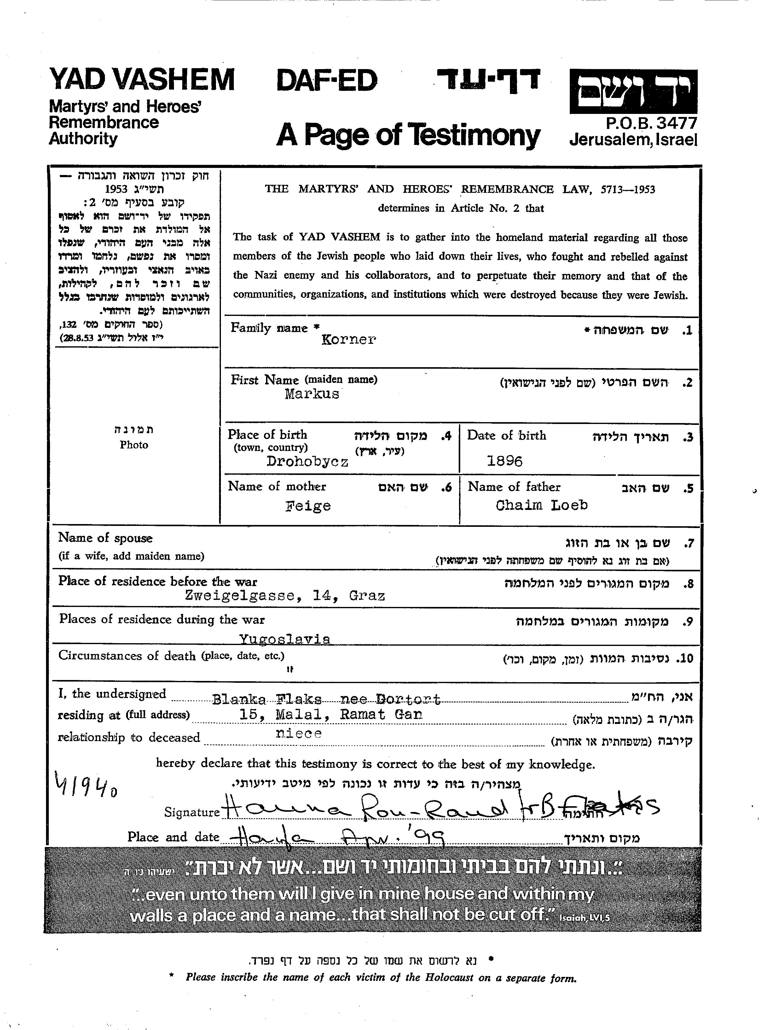 Markus Korner wurde im Jahr 1896 in Drohobycz, Polen geboren. Er war der Sohn von Chaim Löb und Feiga. Vor dem Zweiten Weltkrieg lebte er in Graz, Österreich. Während des Krieges war er in Jugoslawien.