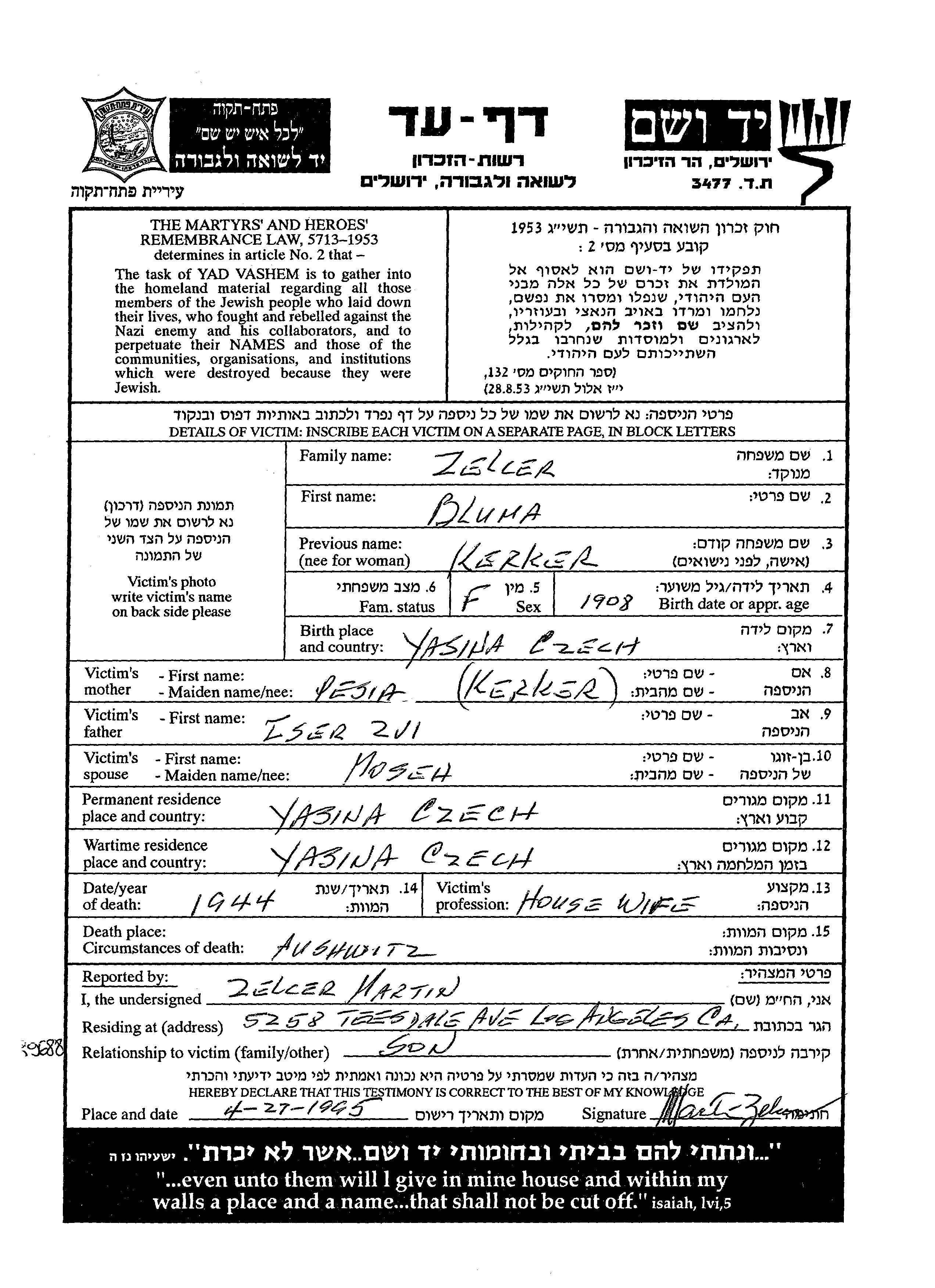 Bluma Zelcer, geb. Kerker wurde im Jahr 1908 in Jasina, Tschechoslowakei geboren. Sie war die Tochter von Isser Zvi und Pesia. Sie war Hausfrau und mit Moseh Verheiratet. Vor dem Zweiten Weltkrieg lebte sie in Jasina, Tschechoslowakei. Während des Krieges war sie in Jasina, Tschechoslowakei.