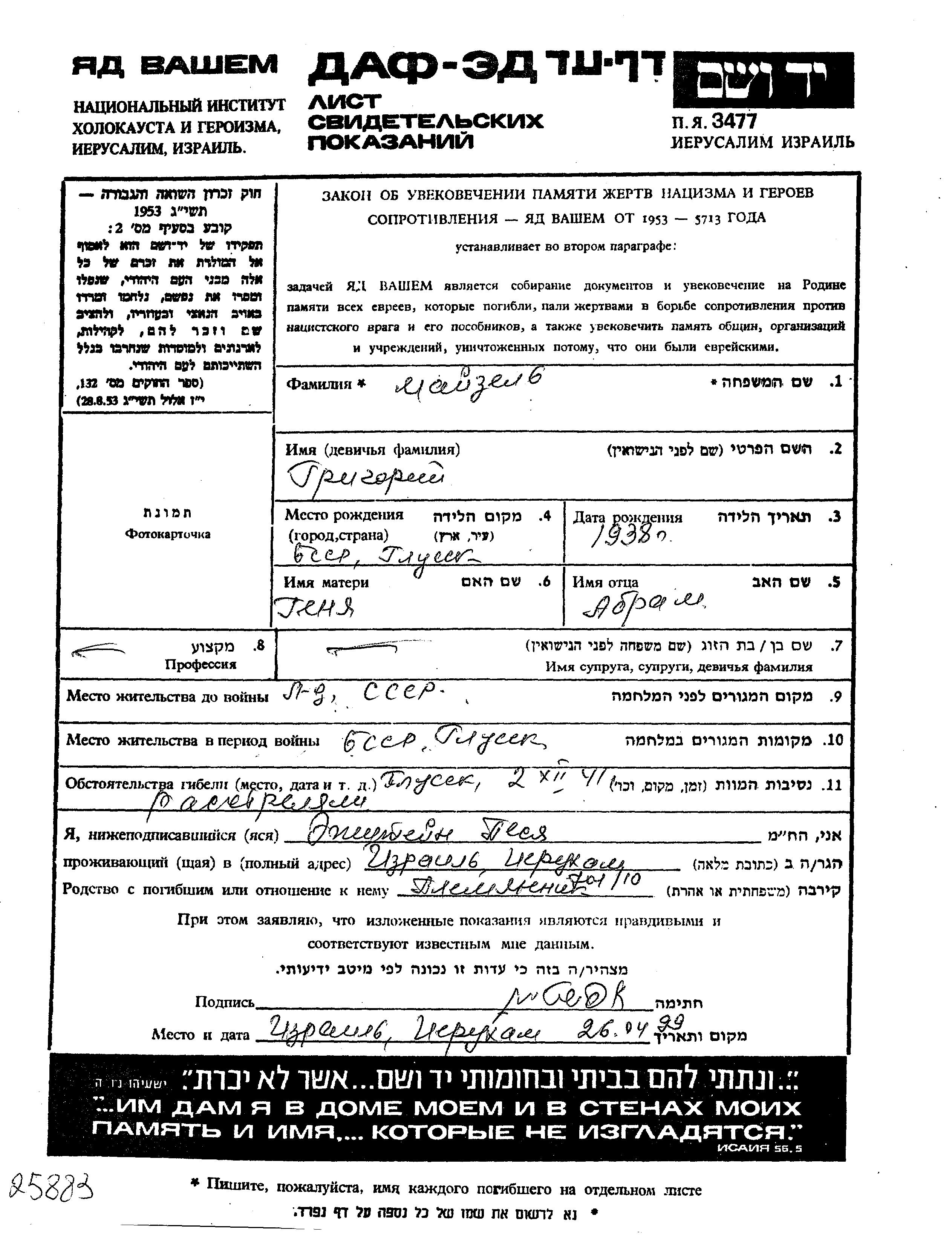 Maizel Grigori 1938 Leningrad, Russland (UdSSR) Gedenkblatt