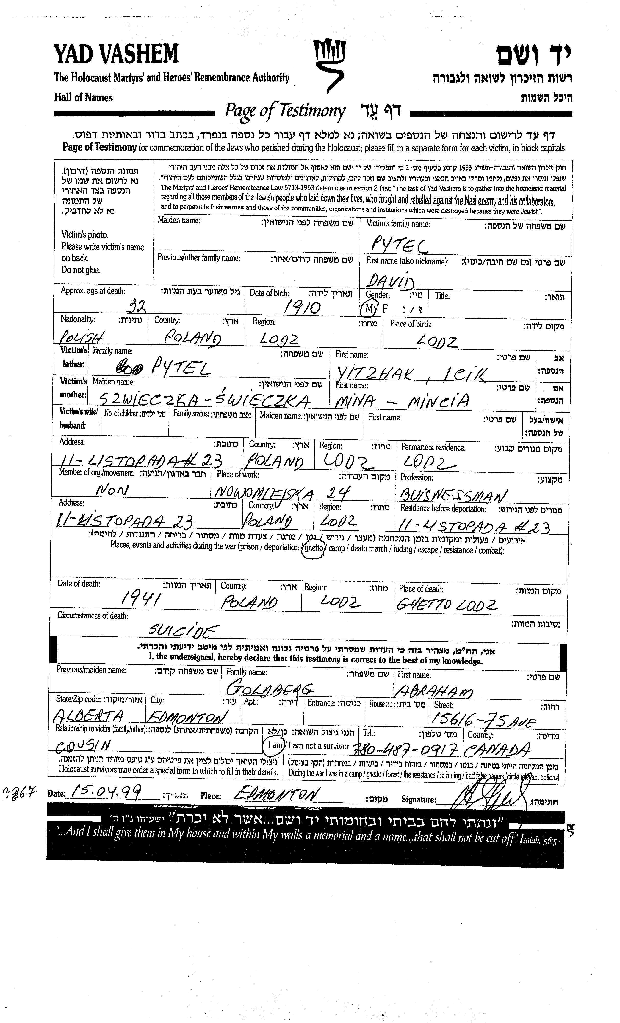 David Pytel wurde im Jahr 1910 in Lodz, Polen geboren. Er war der Sohn von Yitzhak und Mina. Er war Geschäftsmann. Vor dem Zweiten Weltkrieg lebte er in Lodz, Polen. Während des Krieges war er in Lodz, Polen.