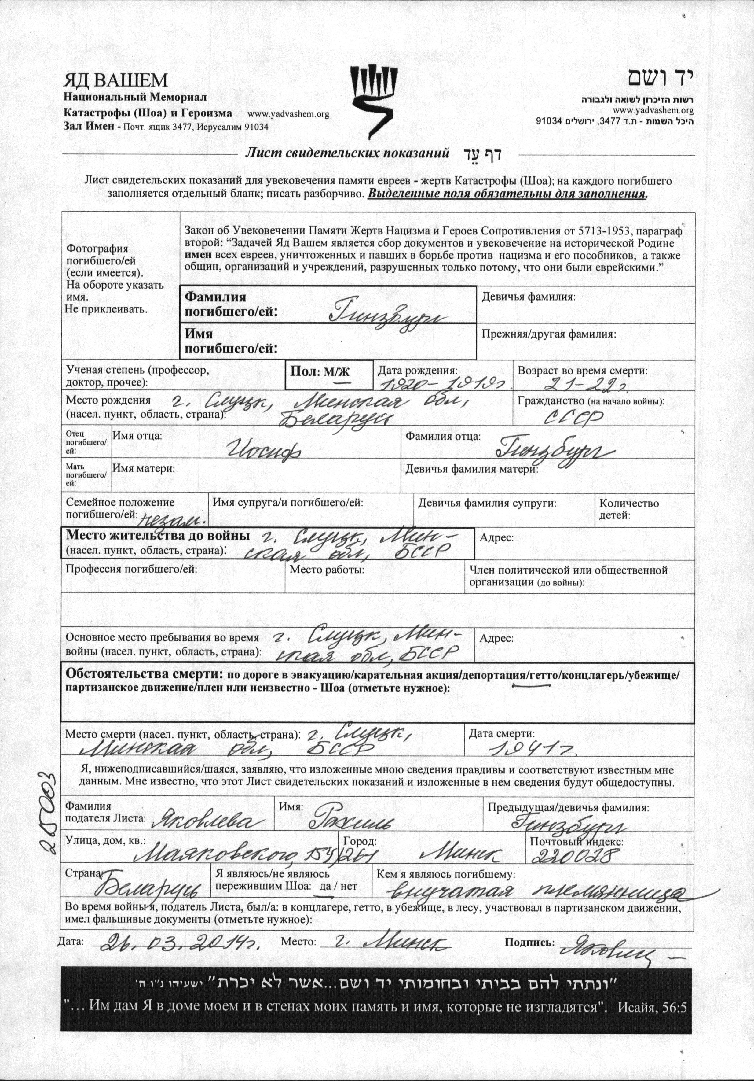 Vorname unbekannt Ginzburg wurde im Jahr 1920 in Slutsk, Weißrussland (UdSSR) geboren. Sie war die Tochter von Iosif. Sie war Ledig. Vor dem Zweiten Weltkrieg lebte sie in Slutsk, Weißrussland (UdSSR). Während des Krieges war sie in Slutsk, Weißrussland (UdSSR).