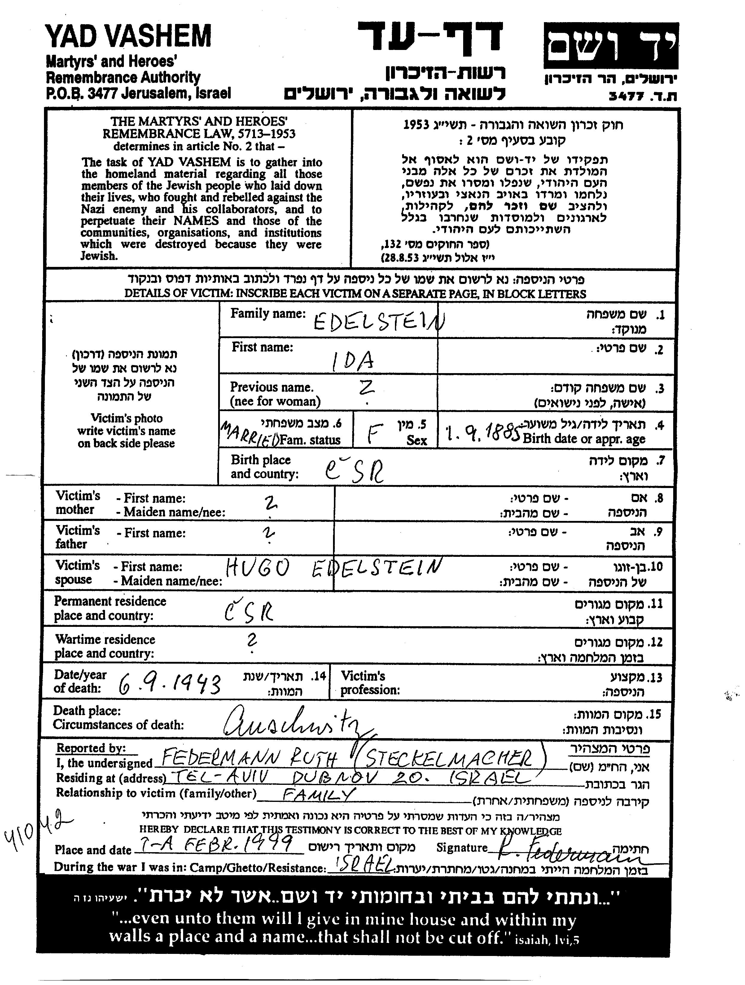 Ida Edelstein wurde im Jahr 1885 in Tschechoslowakei geboren. Sie war mit Hugo Verheiratet. Vor dem Zweiten Weltkrieg lebte sie in Tschechoslowakei.