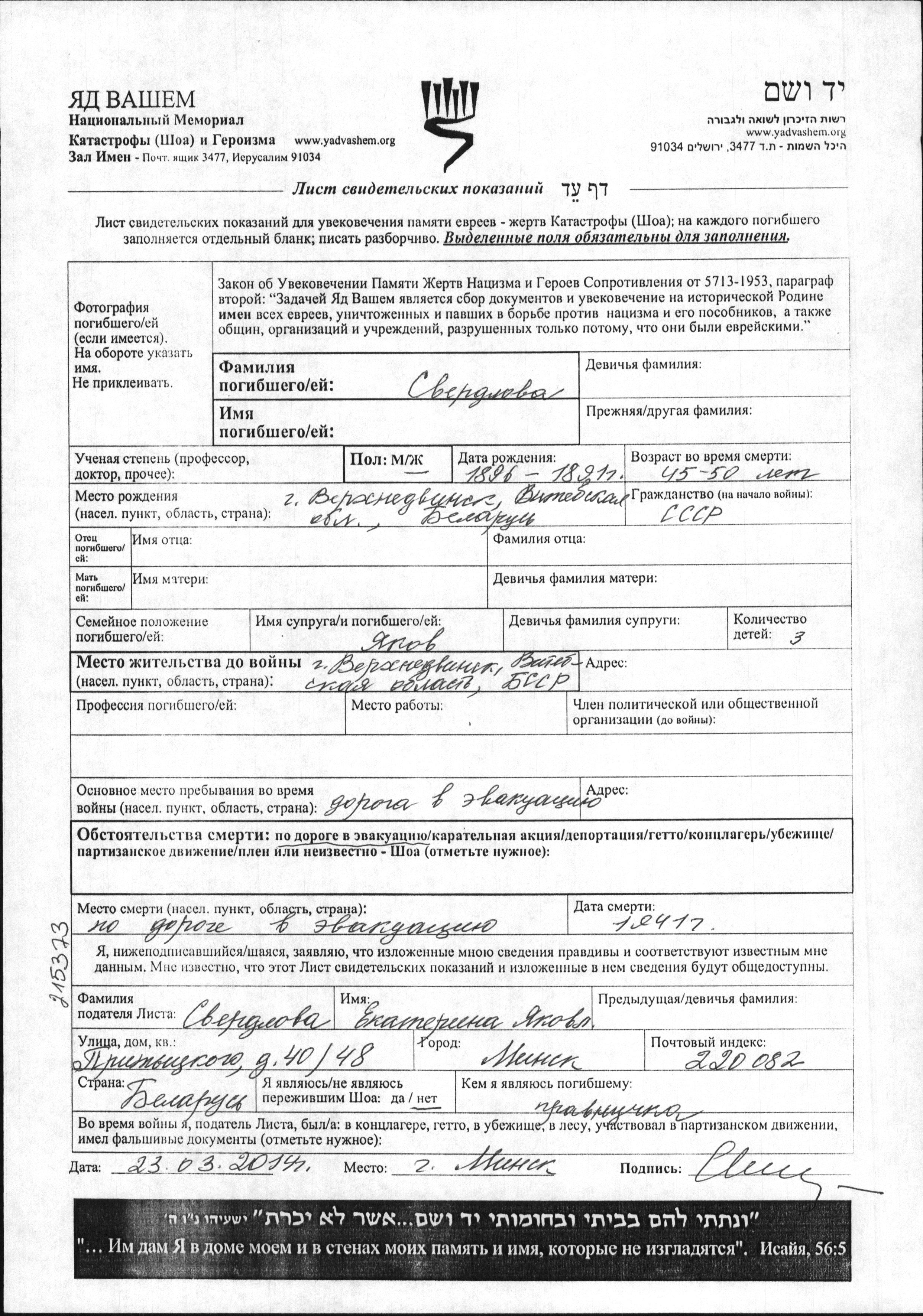 Vorname unbekannt Sverdlova wurde im Jahr 1896 in Verkhnedvinsk, Weißrussland (UdSSR) geboren. Sie war mit Yakov Verheiratet. Vor dem Zweiten Weltkrieg lebte sie in Verkhnedvinsk, Weißrussland (UdSSR).