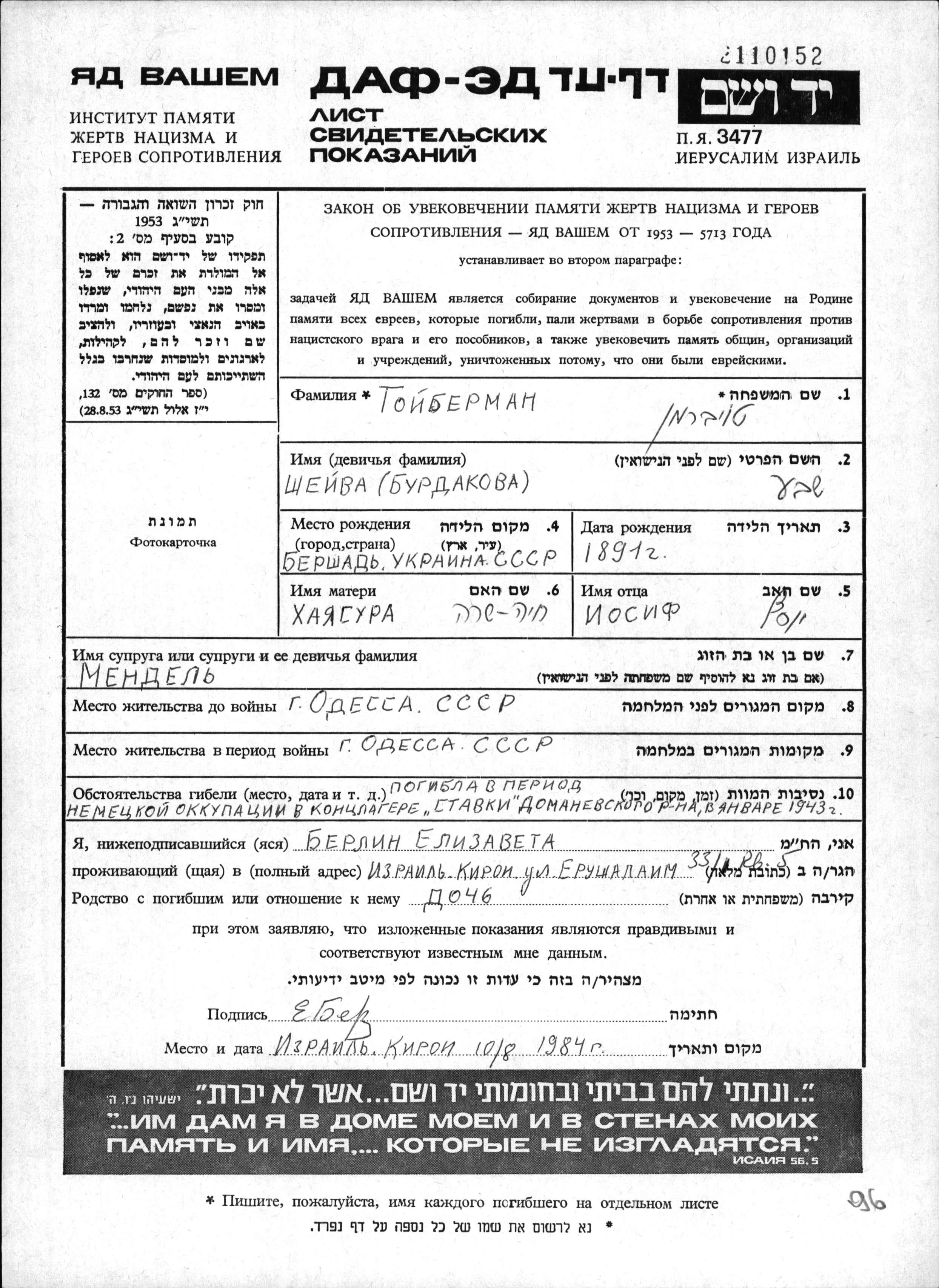 | Toiberman | Sheyva | 1891 | Odessa, Ukraine (UdSSR) | Gedenkblatt |