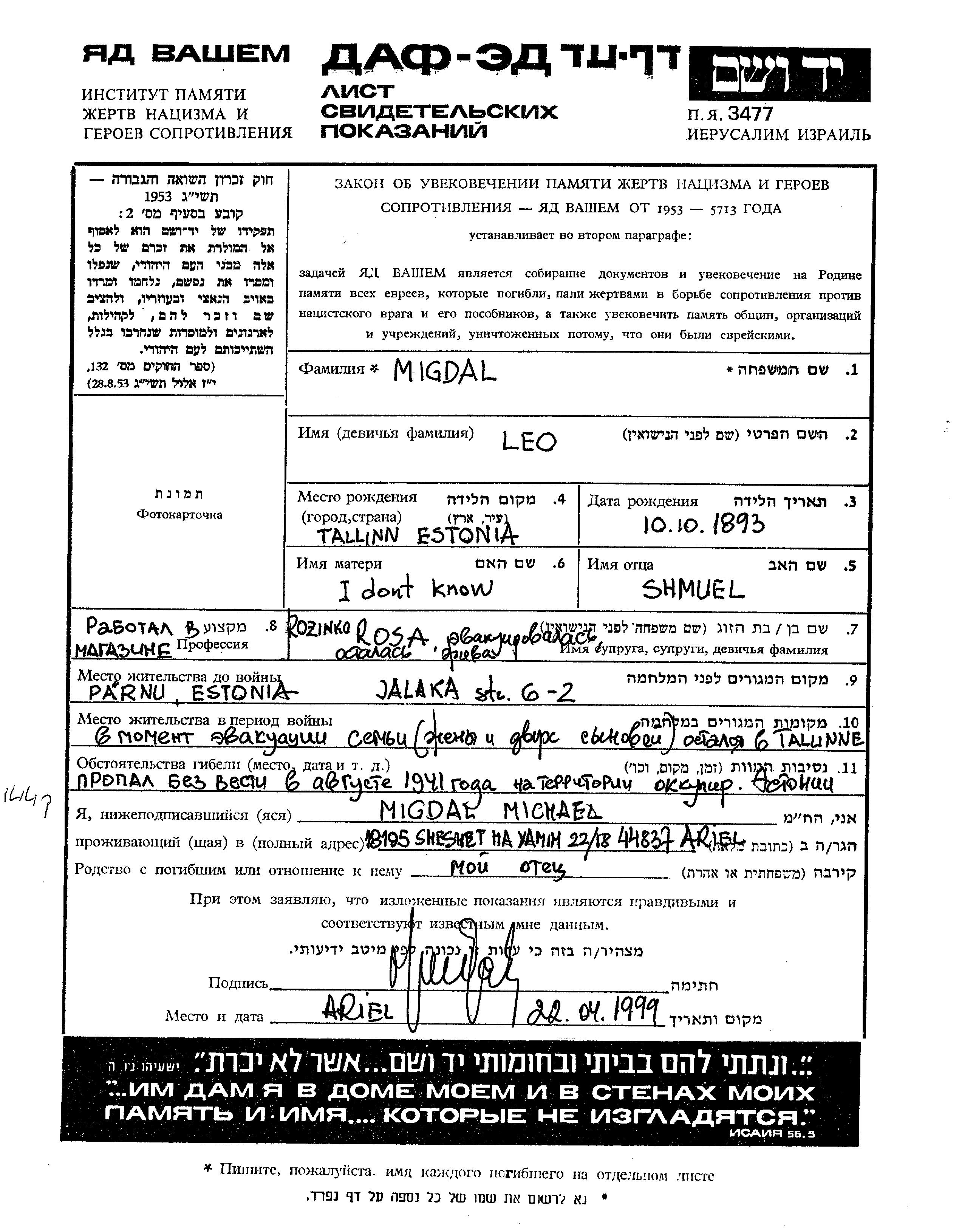 Leo Migdal wurde im Jahr 1893 in Tallin, Estland geboren. Er war der Sohn von Shmuel. Er war Ladenangestellter und mit Rosa, geb. Rozinko Verheiratet. Vor dem Zweiten Weltkrieg lebte er in Parnu, Estland. Während des Krieges war er in Tallin, Estland.