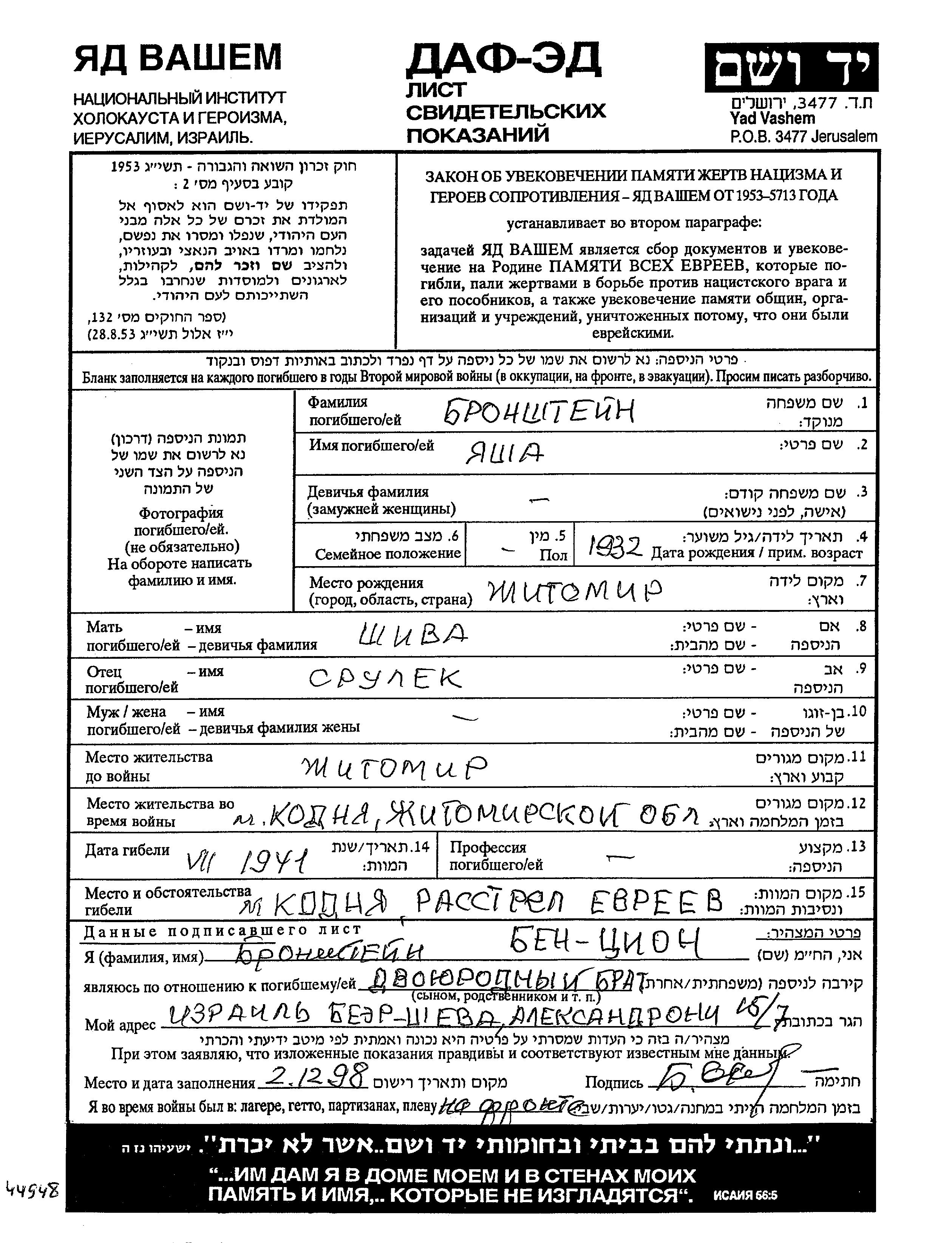 Bronshtein Yasha 1932 Zhitomir, Ukraine (UdSSR) Gedenkblatt