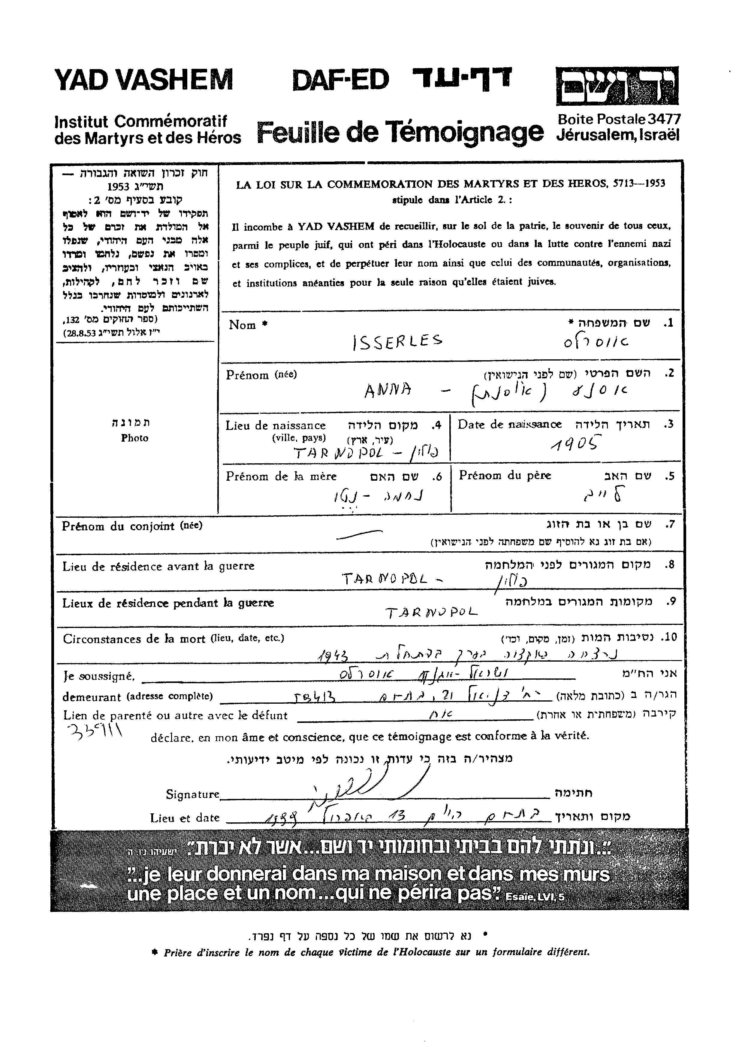 Anna Asnat Isserles wurde im Jahr 1905 in Tarnopol, Polen geboren. Sie war die Tochter von Leib und Nekhama Neti. Vor dem Zweiten Weltkrieg lebte sie in Tarnopol, Polen. Während des Krieges war sie in Tarnopol, Polen.