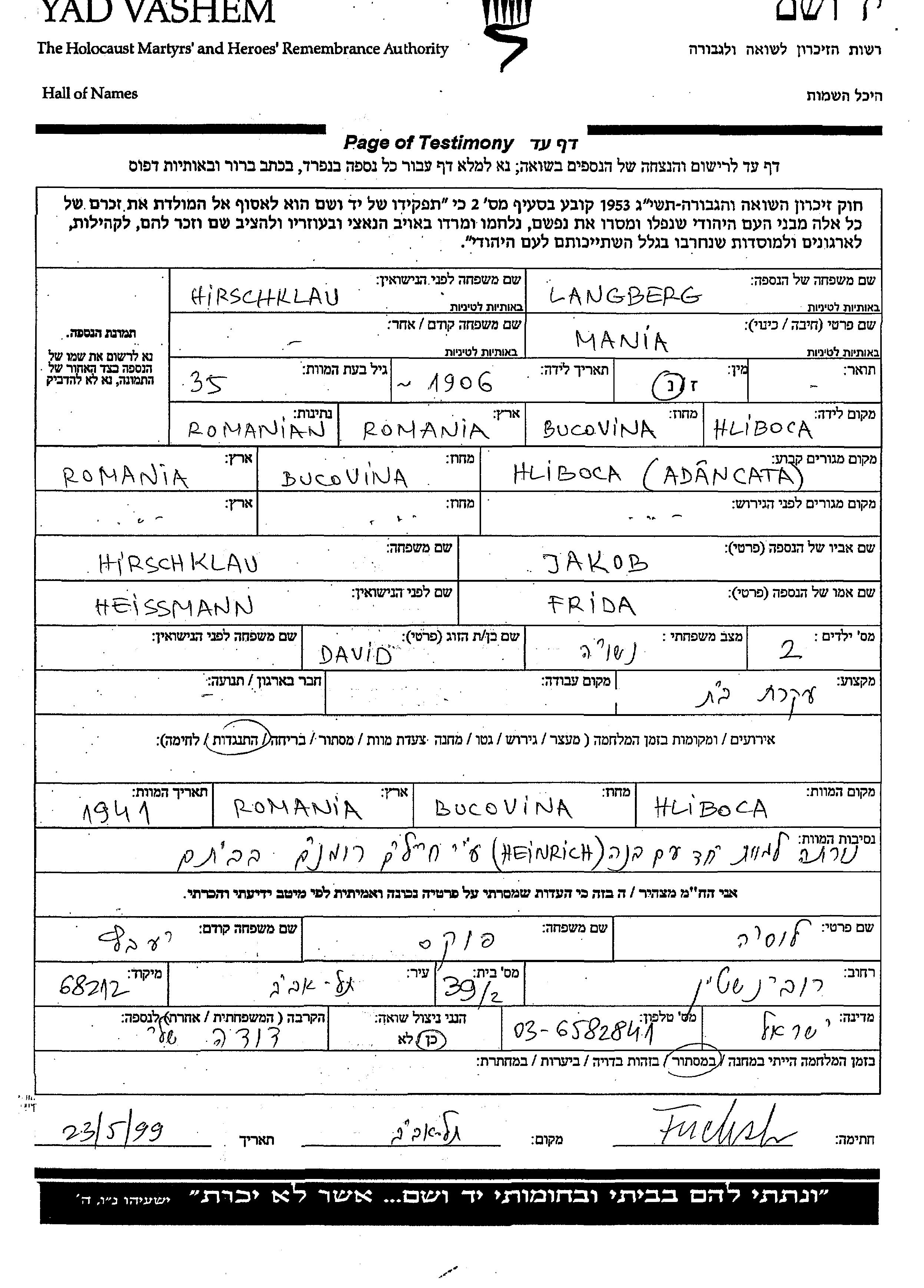 Mania Langberg, geb. Hirschklau wurde im Jahr 1906 in Hliboca, Rumänien geboren. Sie war die Tochter von Jakob und Frida. Sie war Hausfrau und mit David Verheiratet. Vor dem Zweiten Weltkrieg lebte sie in Hliboca, Rumänien. Während des Krieges war sie in Hliboca, Rumänien.