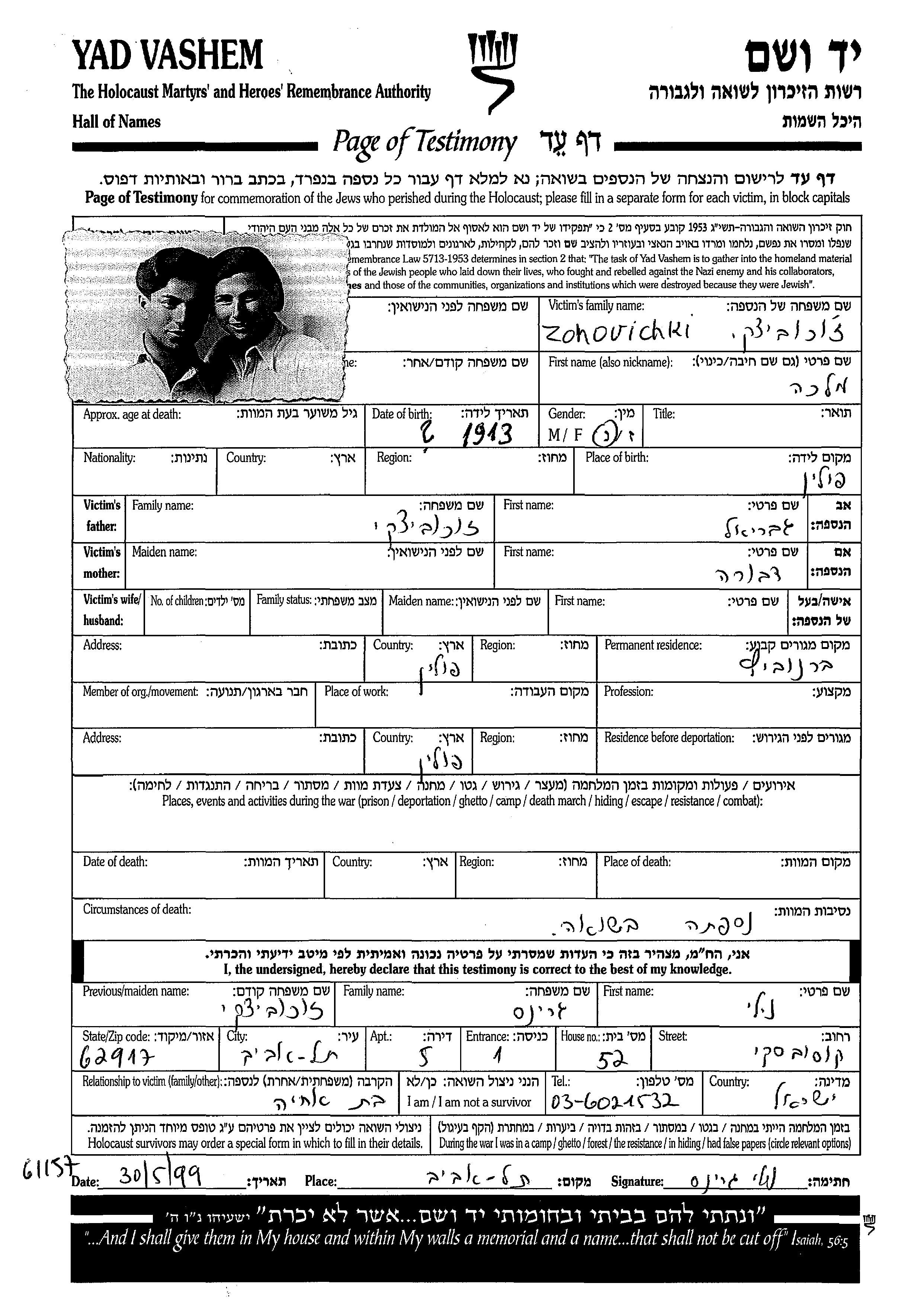 Malka Zohovichki wurde im Jahr 1913 in Polen geboren. Sie war die Tochter von Gabriel und Dvora. Vor dem Zweiten Weltkrieg lebte sie in Baranovich, Polen. Während des Krieges war sie in Polen.