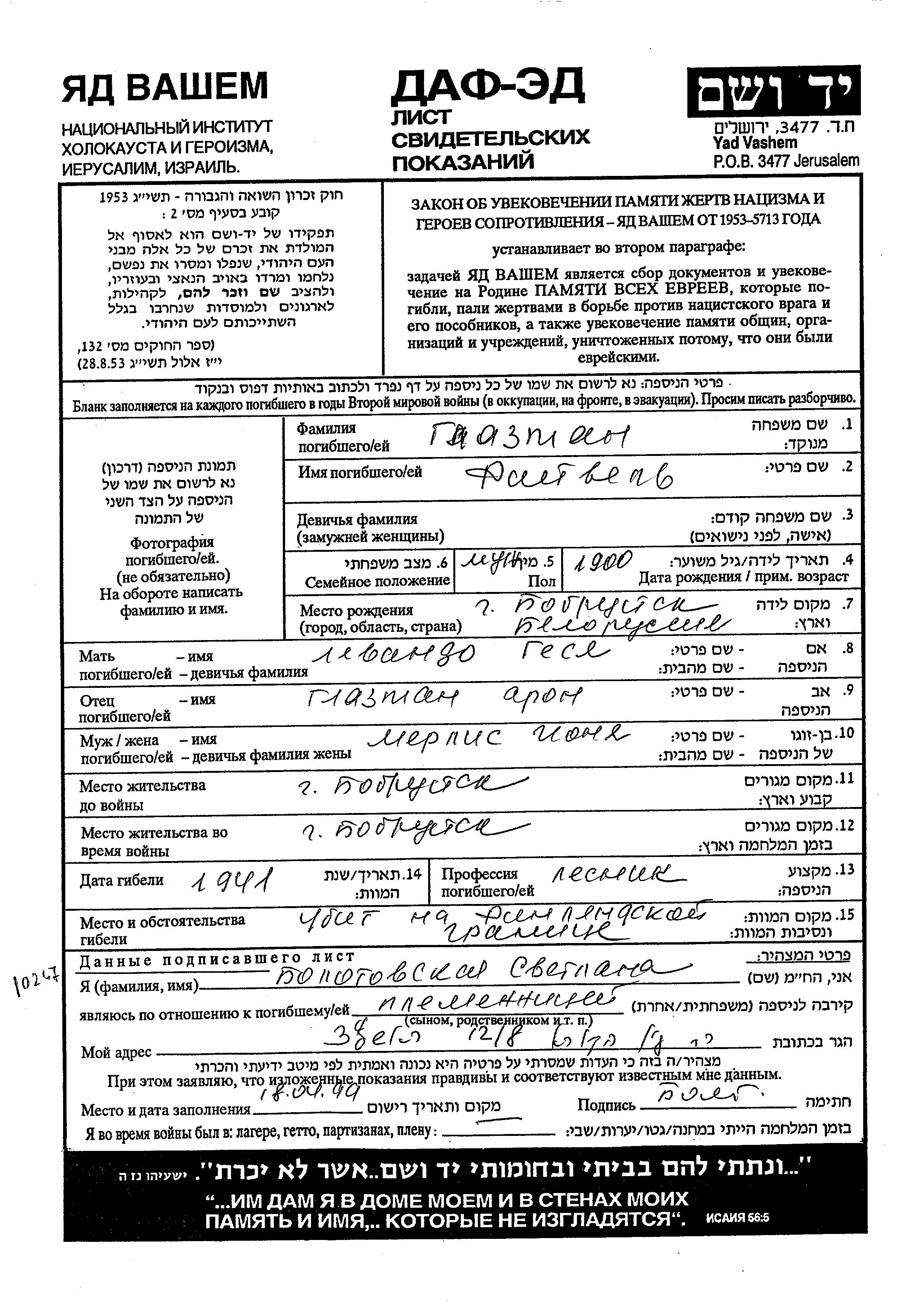 Fayvel Glazman wurde im Jahr 1900 in Bobruysk, Weißrussland (UdSSR) geboren. Er war der Sohn von Aron und Gesia. Er war Förster und mit Ione, geb. Merlis Verheiratet. Vor dem Zweiten Weltkrieg lebte er in Bobruysk, Weißrussland (UdSSR). Während des Krieges war er in Bobruysk, Weißrussland (UdSSR).
