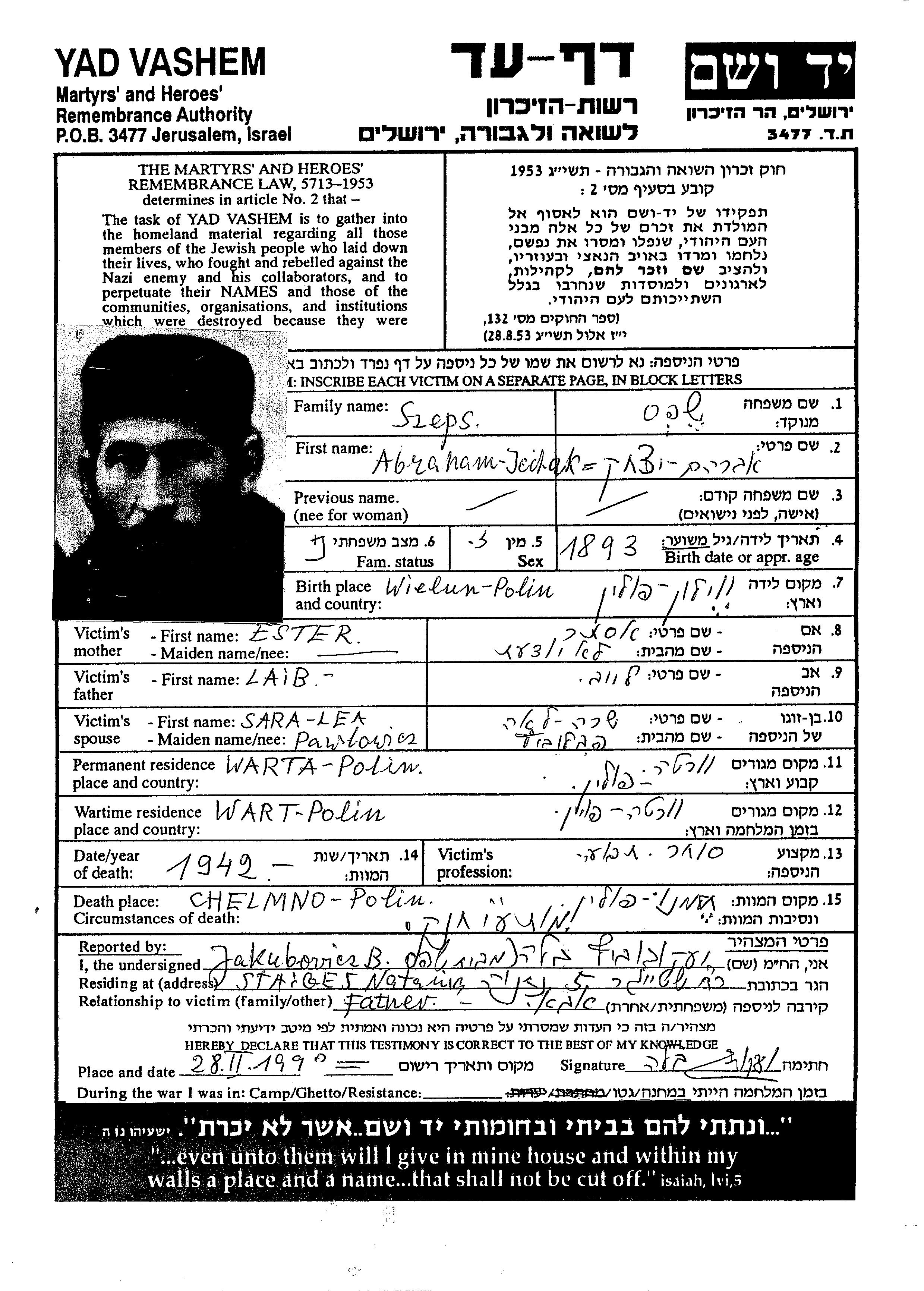 Abraham Ichak Szeps wurde im Jahr 1893 in Wielun, Polen geboren. Er war der Sohn von Laib und Ester. Er war Getreidehändler/-in und mit Sara Lea, geb. Pawlowicz Verheiratet. Vor dem Zweiten Weltkrieg lebte er in Warta, Polen. Während des Krieges war er in Warta, Polen.