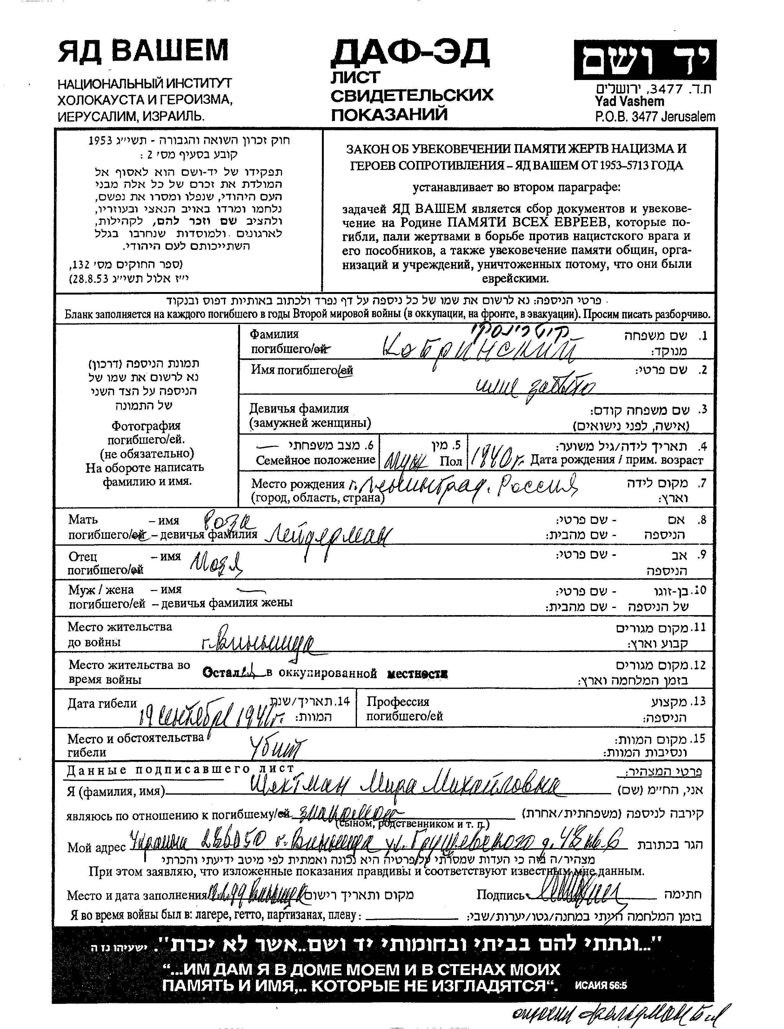 Kobrinski Vorname unbekannt 1940 Vinitza, Ukraine (UdSSR) Gedenkblatt