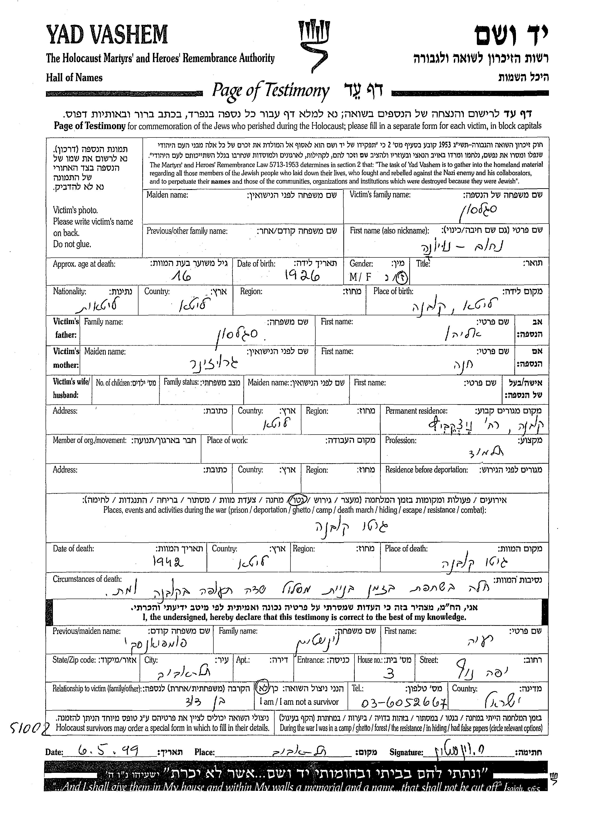 Nakhum wurde in der Schoah ermordet. Todesort: Kovno, Litauen im Jahr 1942.