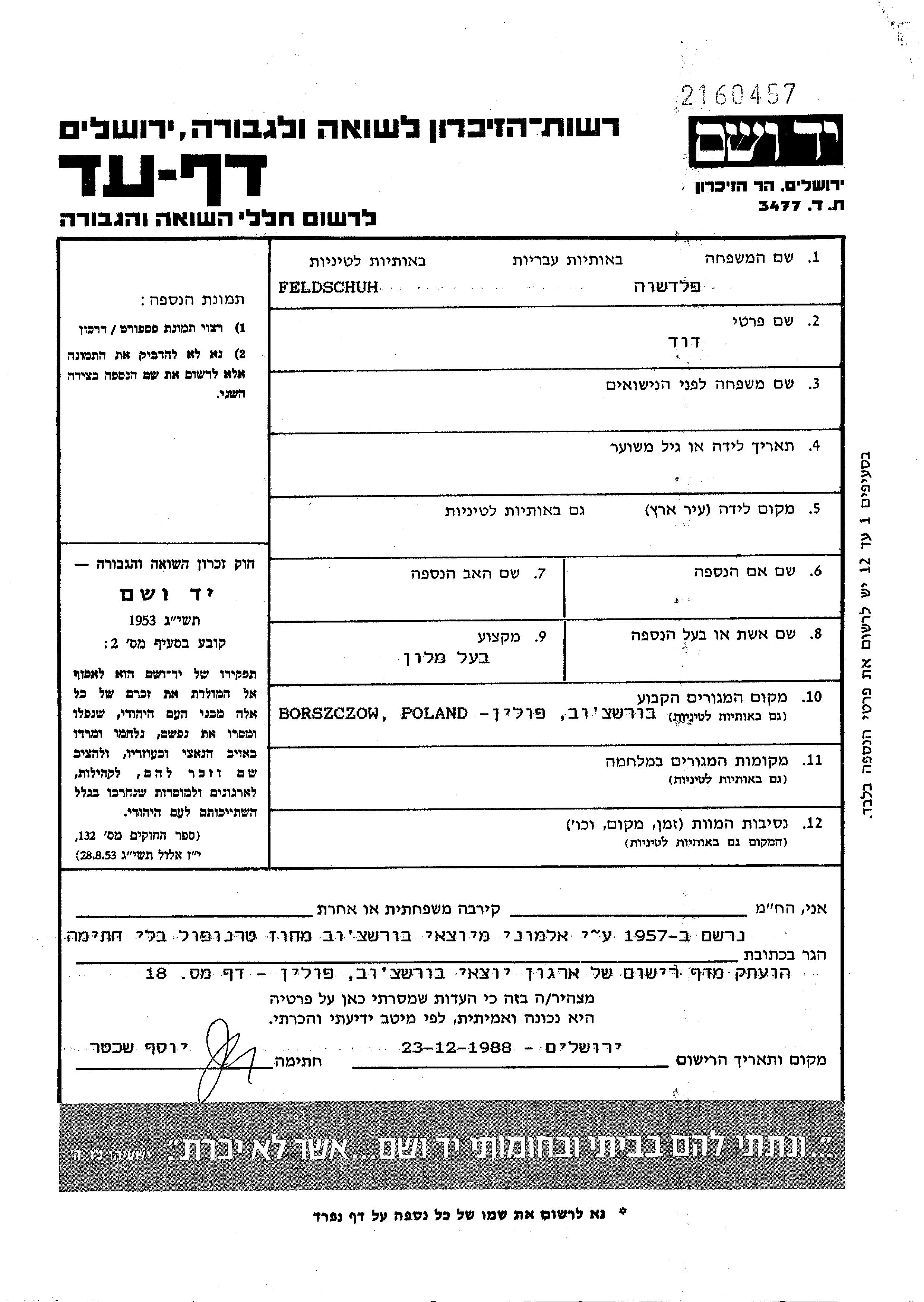 Feldschuh | David | Borszczow, Polen | Gedenkblatt | |