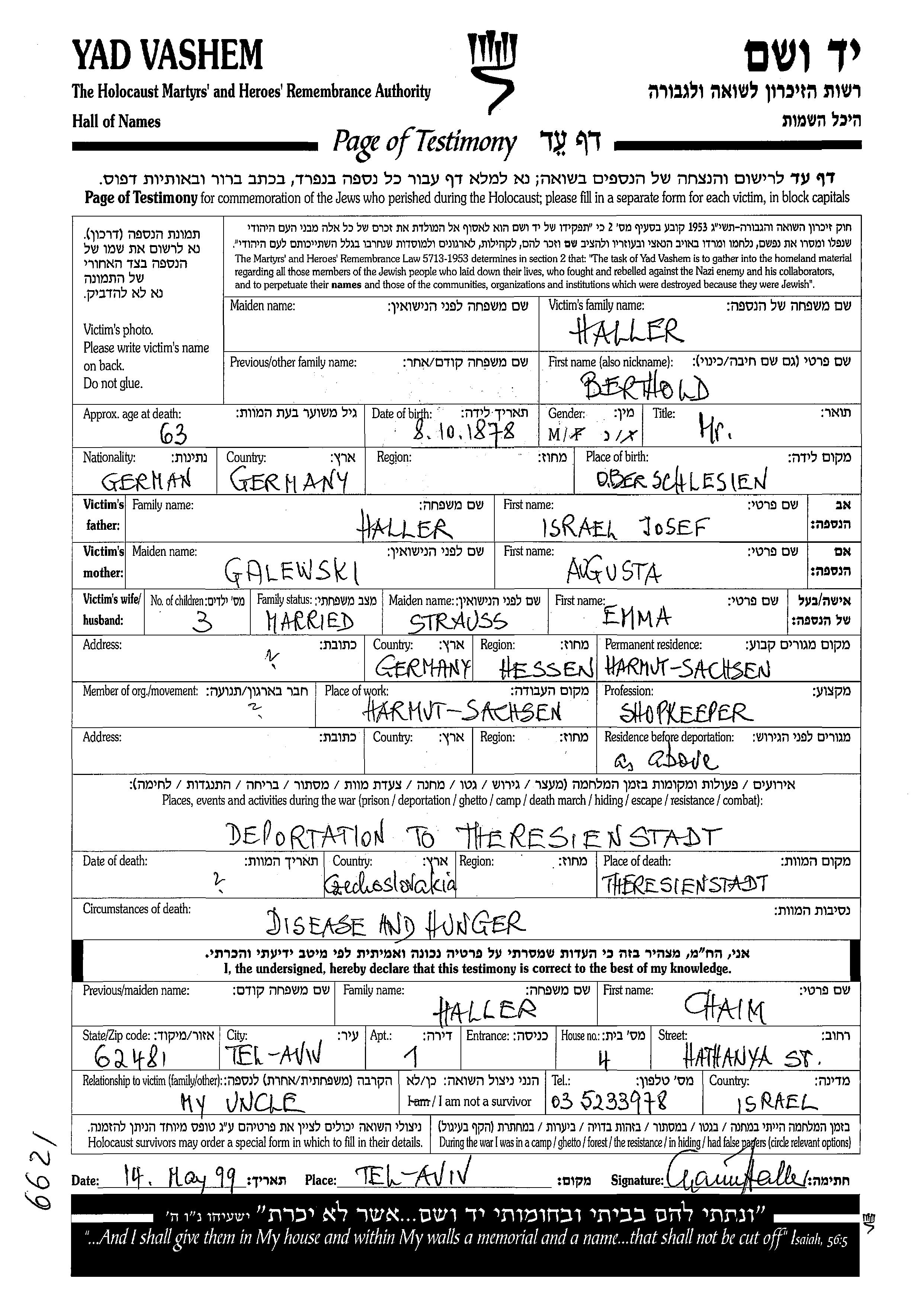 Berthold Haller wurde im Jahr 1878 in Oberschlesien, Deutsches Reich geboren. Er war der Sohn von Israel Josef und Augusta. Er war Ladenbesitzer/-in und mit Emma, geb. Strauss Verheiratet. Vor dem Zweiten Weltkrieg lebte er in Harmuthsachsen, Deutsches Reich. Während des Krieges war er in Harmuthsachsen, Deutsches Reich.