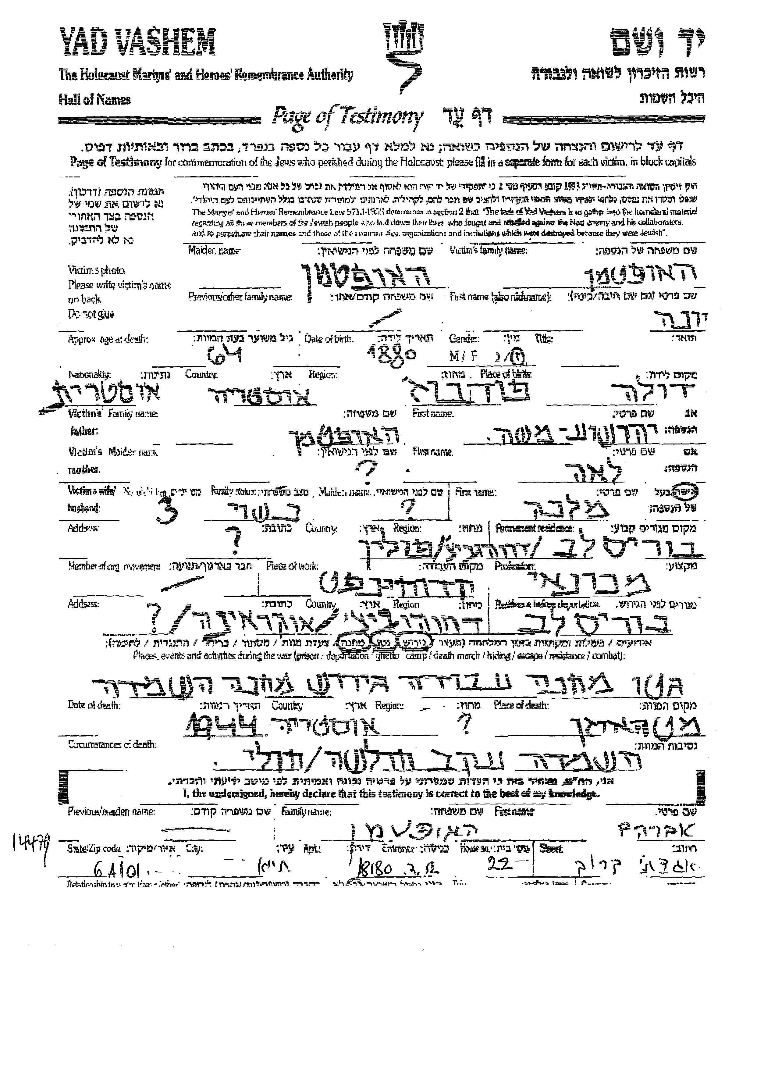 Yona Hauptman wurde im Jahr 1880 in Dolhe Podbuskie, Polen geboren. Er war der Sohn von Yehoshua Moshe und Lea. Er war מכונאי קידוחי נפט und mit Malka Verheiratet. Vor dem Zweiten Weltkrieg lebte er in Borislaw, Polen. Während des Krieges war er in Borislaw, Polen.