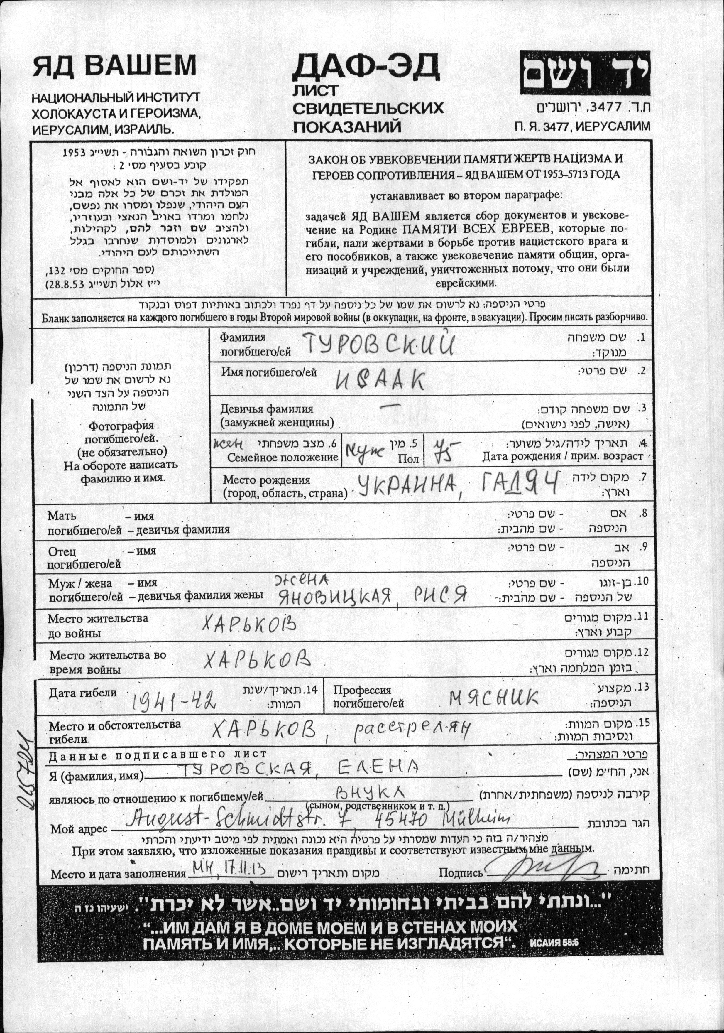 Isaak Turovski wurde in Gadyach, Ukraine (UdSSR) geboren. Er war Metzger/-in und mit Risya, geb. Yanovitzki Verheiratet. Vor dem Zweiten Weltkrieg lebte er in Kharkov, Ukraine (UdSSR). Während des Krieges war er in Kharkov, Ukraine (UdSSR).