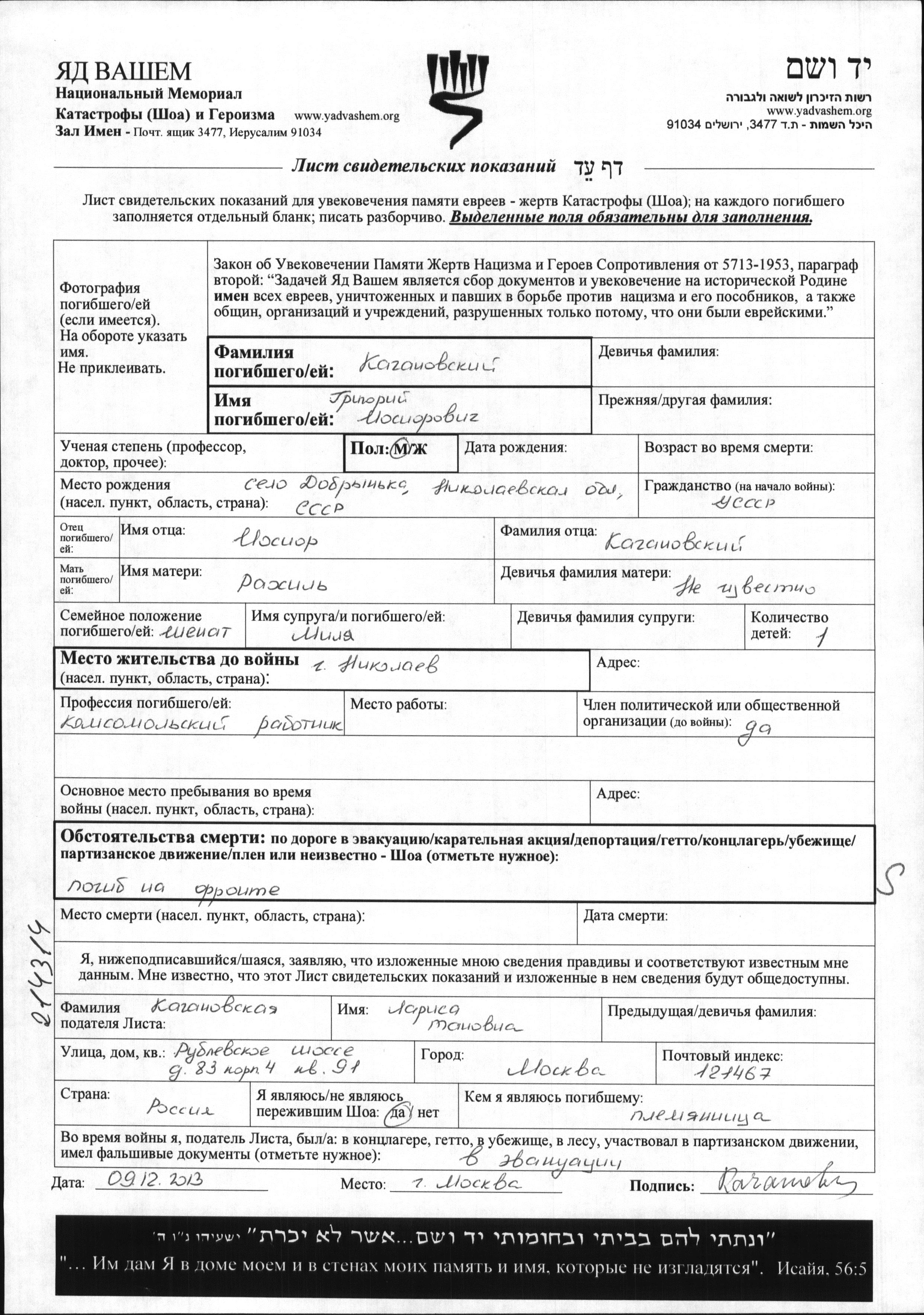 Grigoriy Kaganovskiy wurde in Dobrynka, Ukraine (UdSSR) geboren. Er war der Sohn von Iosif und Rakhil. Er war Komsomolski rabotnik und mit Milya Verheiratet. Vor dem Zweiten Weltkrieg lebte er in Nikolayev, Ukraine (UdSSR). Während des Krieges war er in die Sowjetischen Streitkräfte.