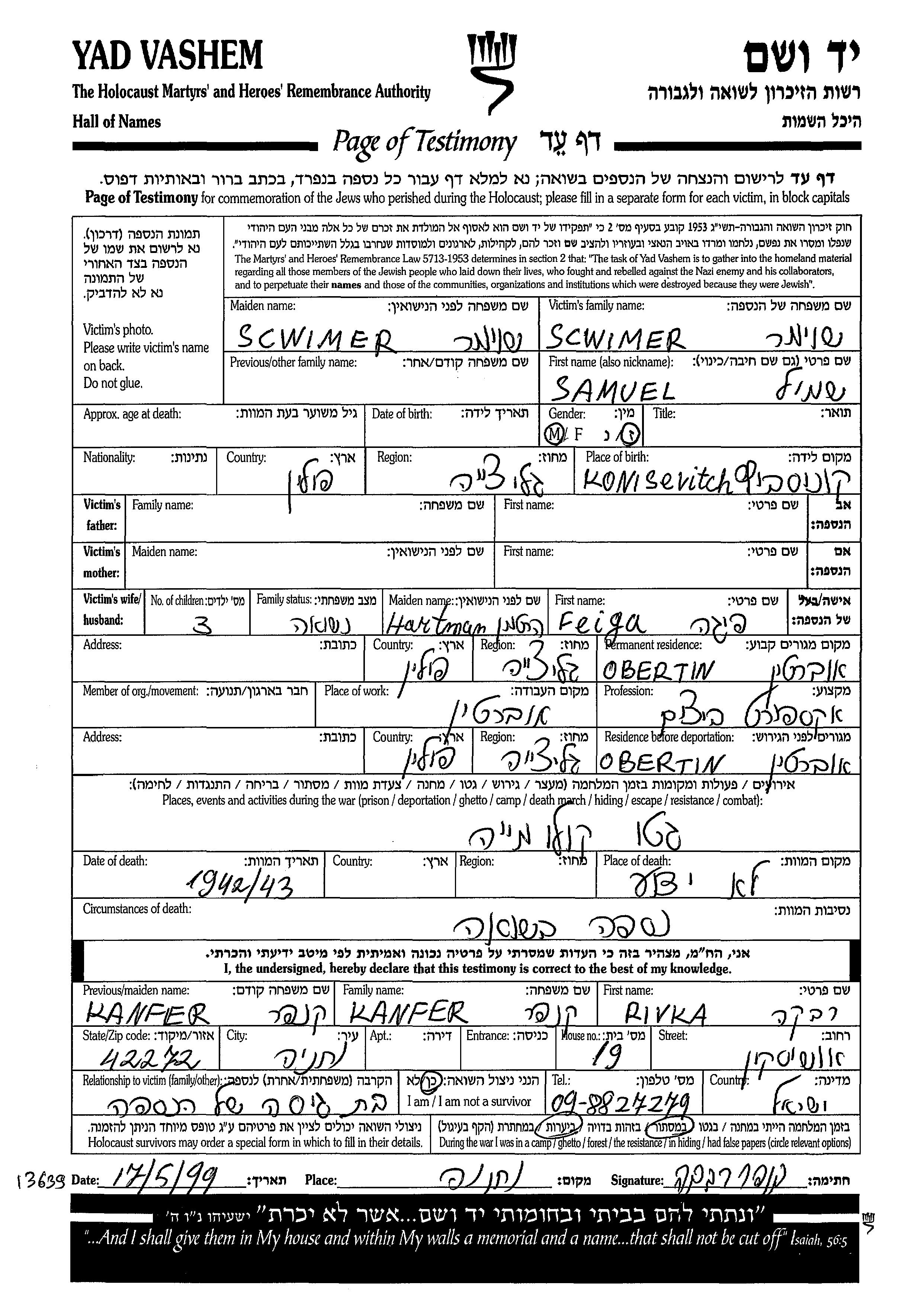 Shmil Schwimer wurde in Kunisowce, Polen geboren. Er war יצוא ביצים und mit Feiga, geb. Hartman Verheiratet. Vor dem Zweiten Weltkrieg lebte er in Obertin, Polen. Während des Krieges war er in Obertin, Polen.