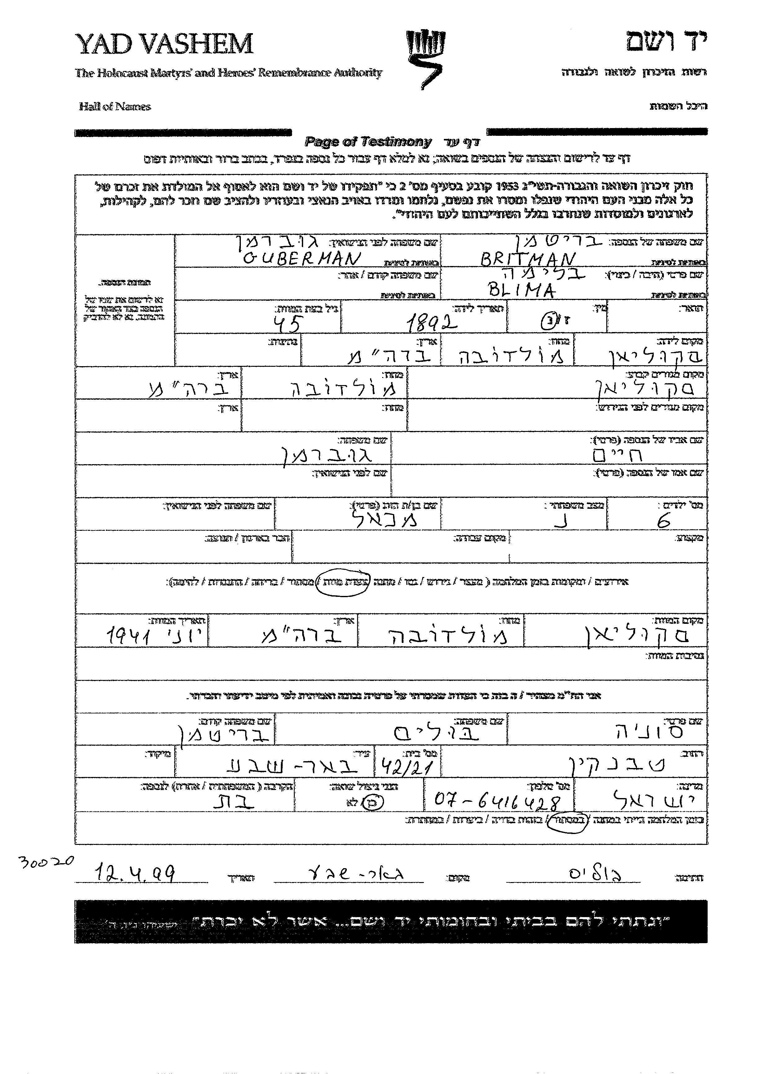 Blima Britman, geb. Goberman wurde im Jahr 1892 in Sculeni, Rumänien geboren. Sie war die Tochter von Khaim. Sie war mit Mekhael Verheiratet. Vor dem Zweiten Weltkrieg lebte sie in Sculeni, Rumänien. Während des Krieges war sie in Sculeni, Rumänien.