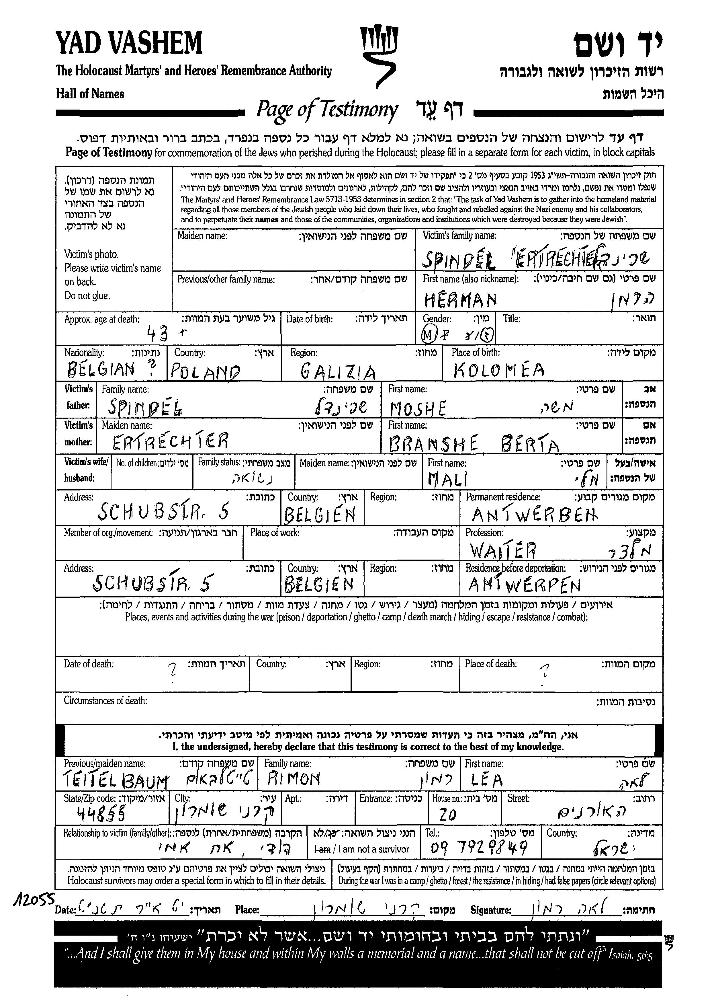 Herman Spindel Shpingold wurde in Kolomyja, Polen geboren. Er war der Sohn von Moshe und Branshe Berta. Er war Kellner/in und mit Mali Mali Verheiratet. Vor dem Zweiten Weltkrieg lebte er in Antwerpen, Belgien. Während des Krieges war er in Antwerpen, Belgien.