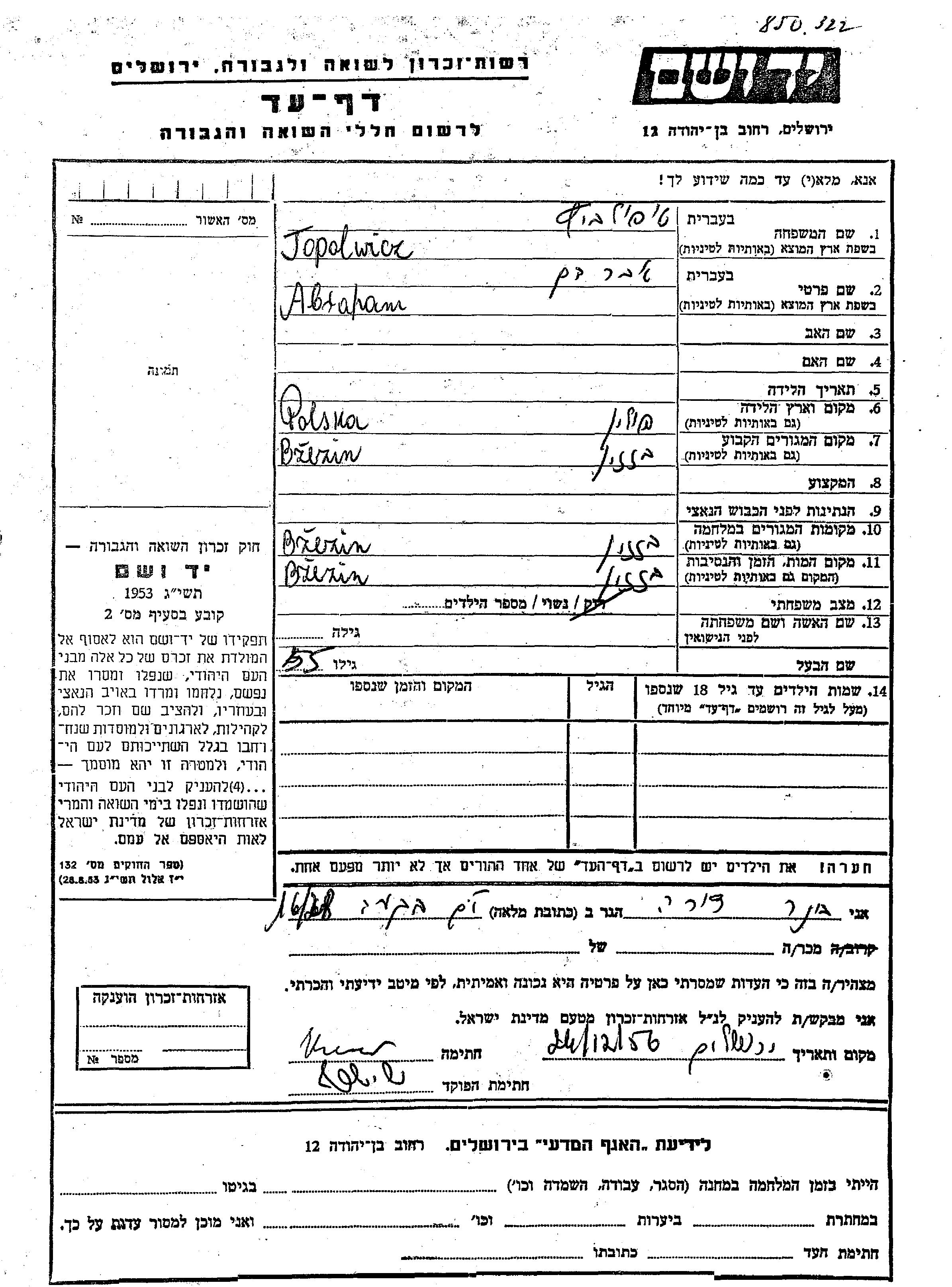 Abraham Topolwicz wurde in Polen geboren. Er war Verheiratet. Vor dem Zweiten Weltkrieg lebte er in Bzezin, Polen. Während des Krieges war er in Bzezin, Polen.